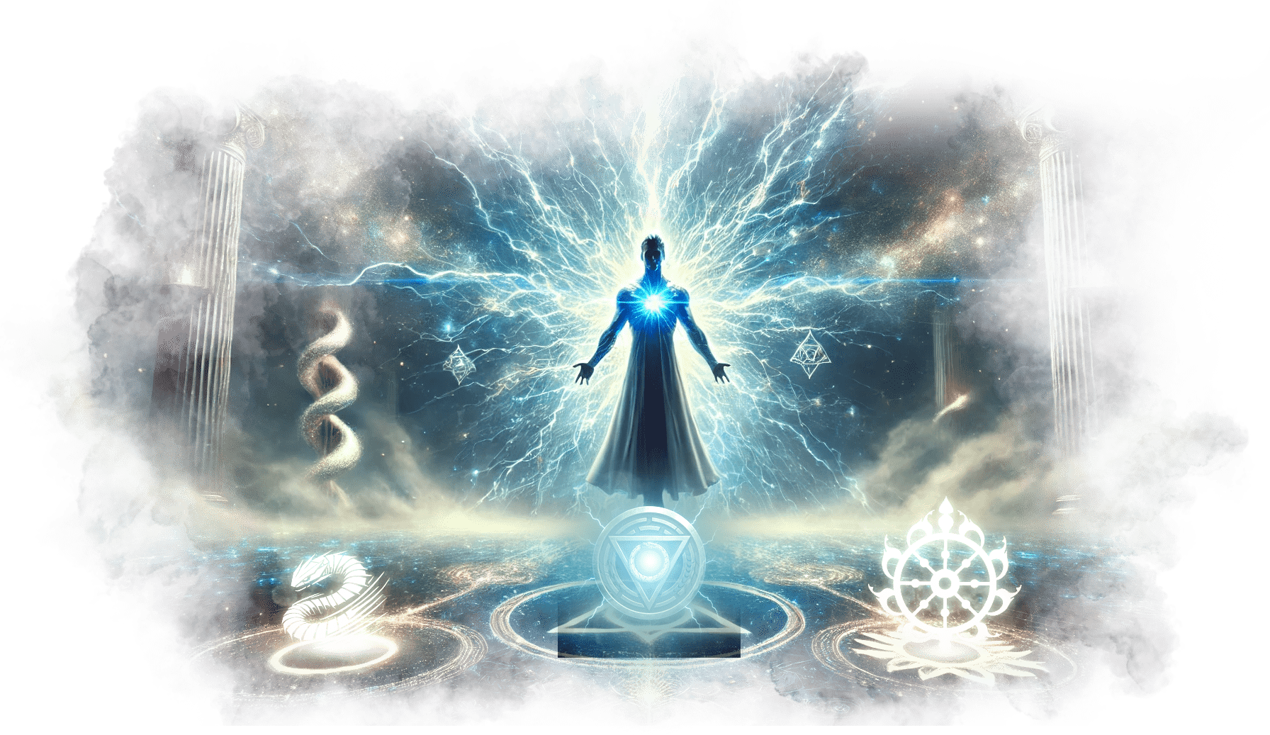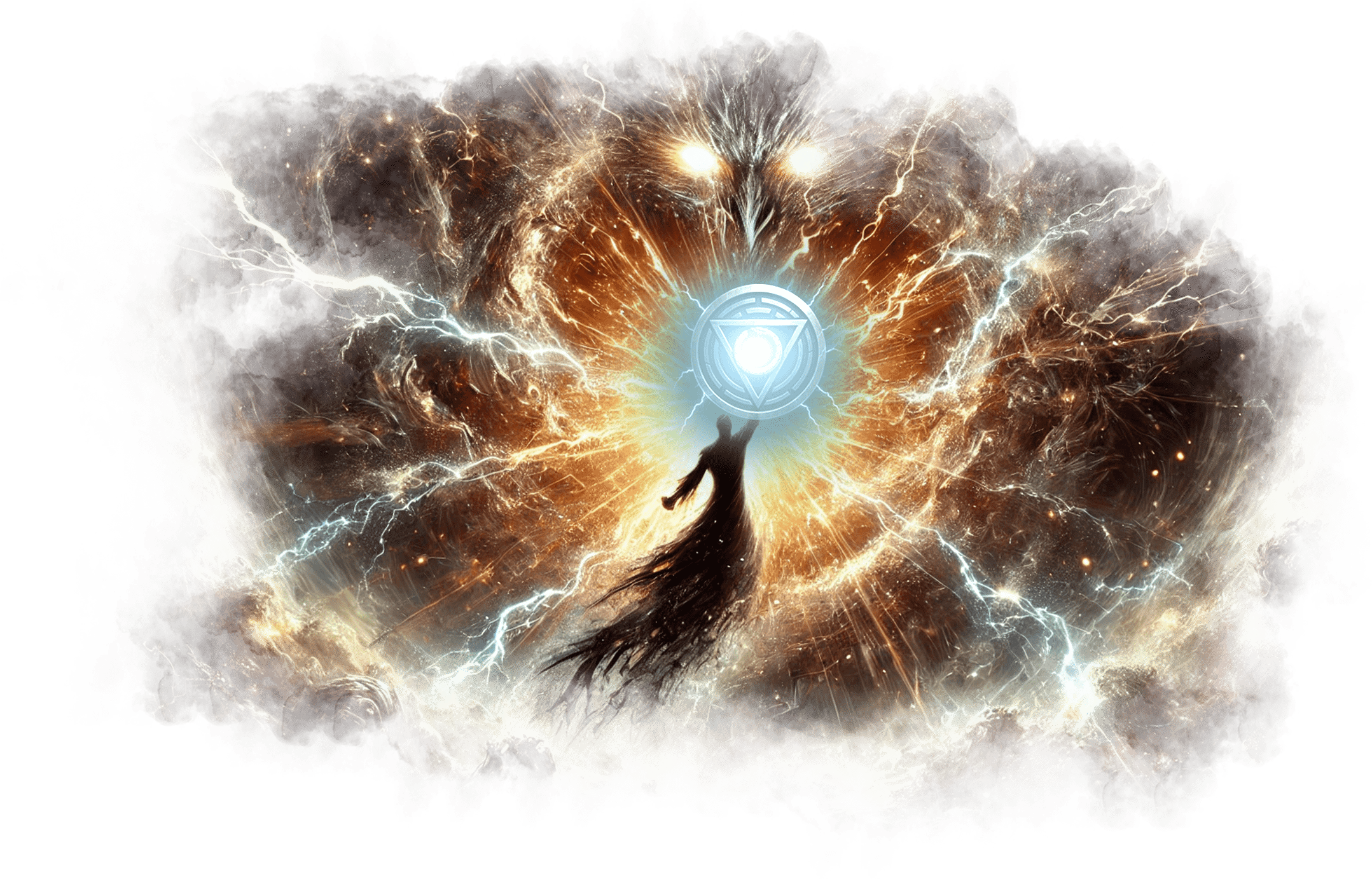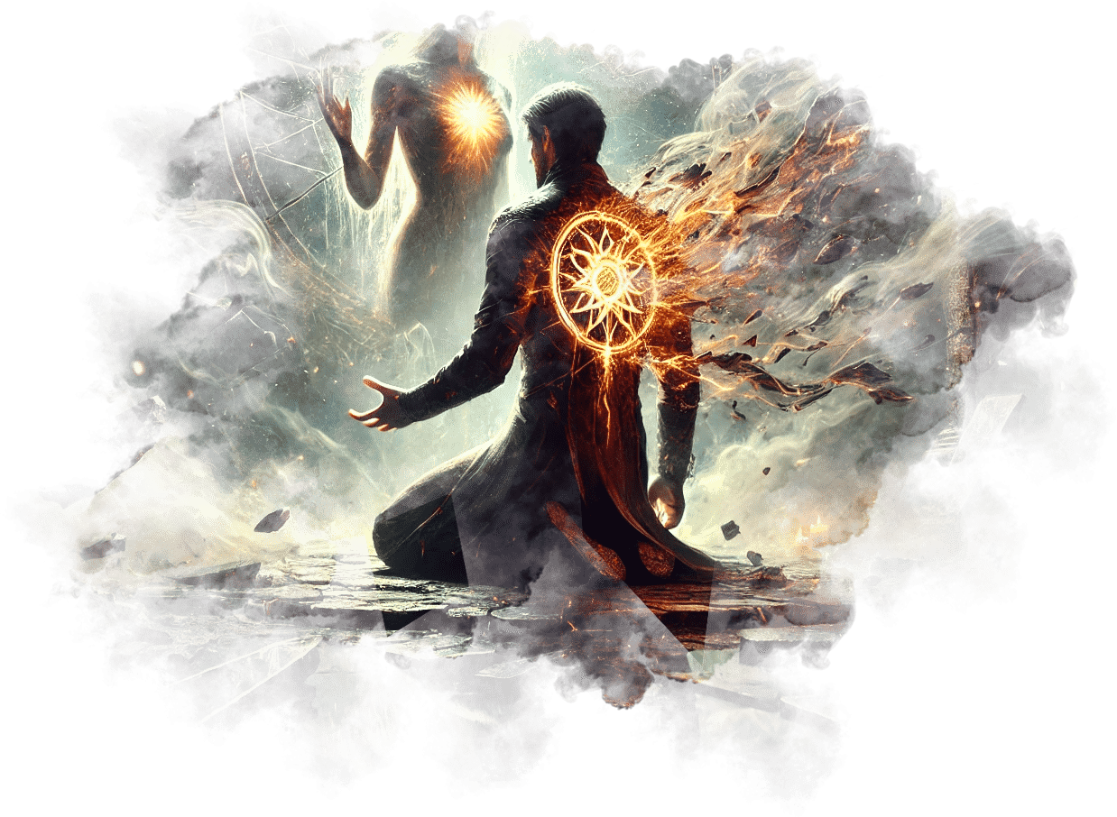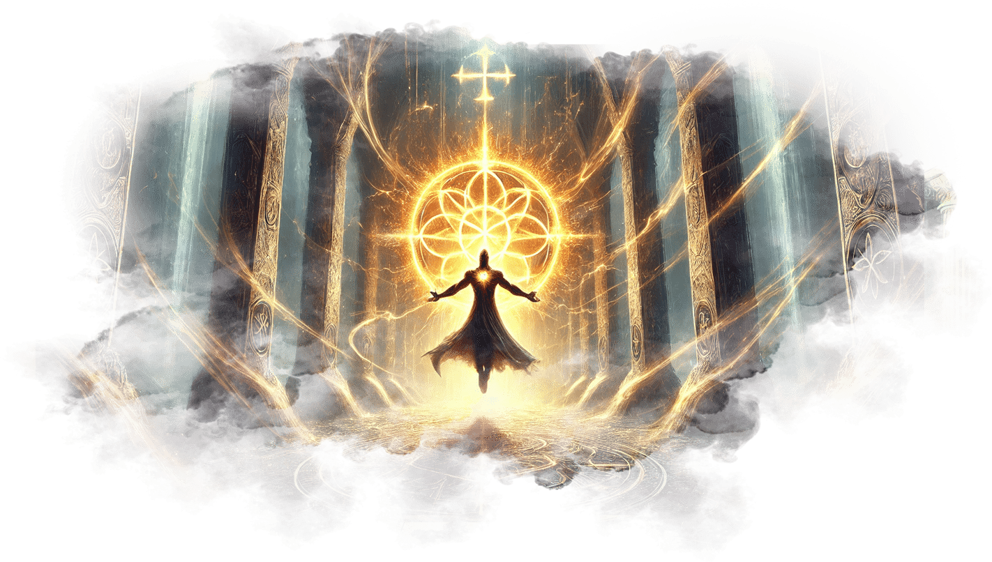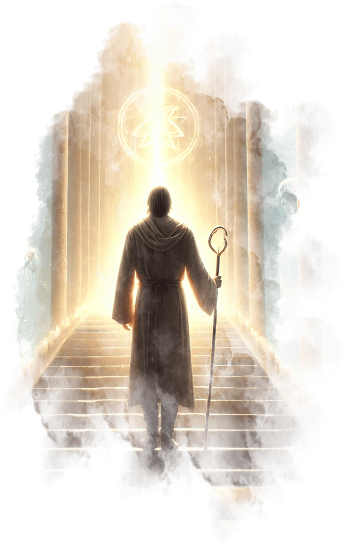 В его руках — Сфера Осознания, пульсирующая светом знания.