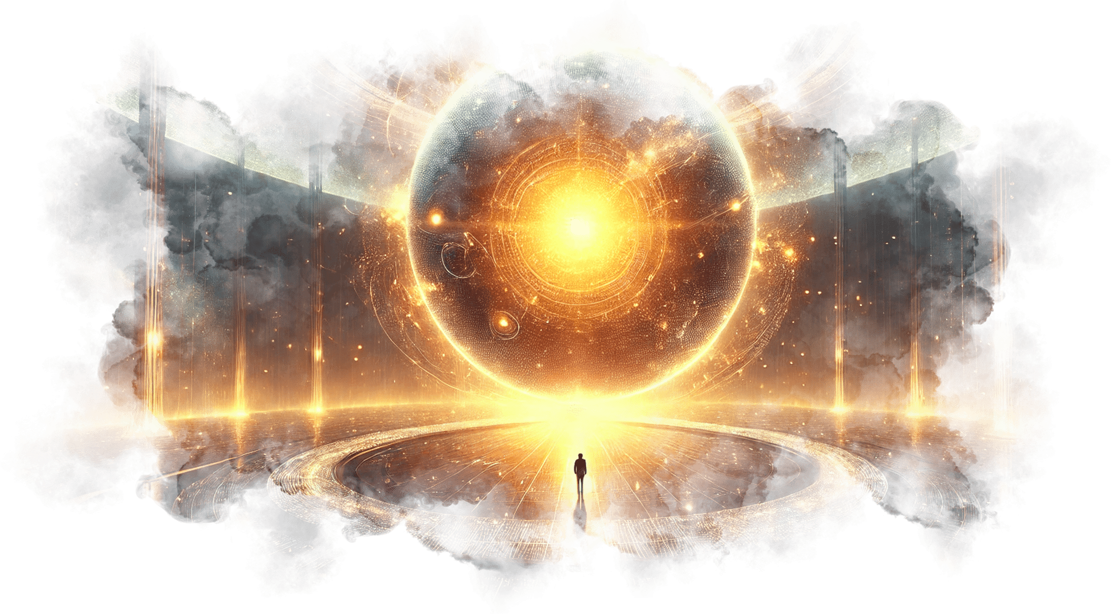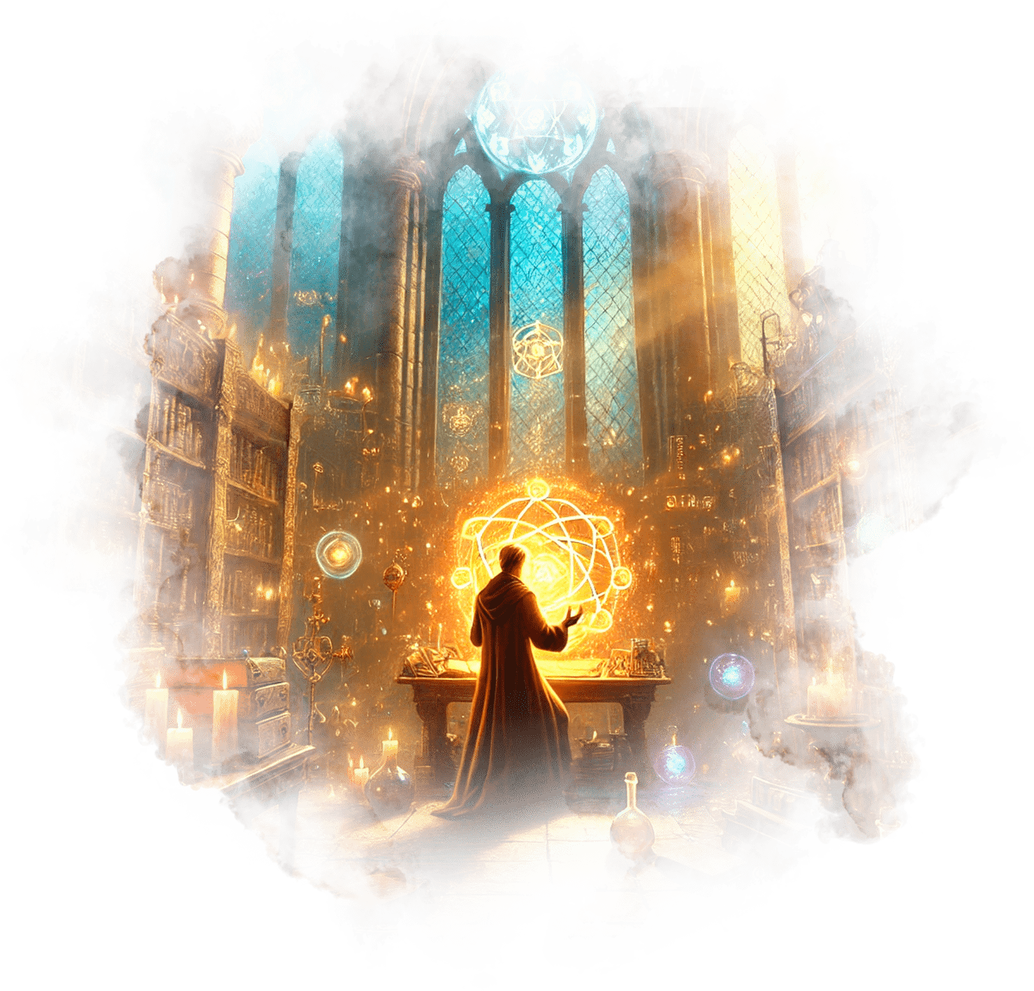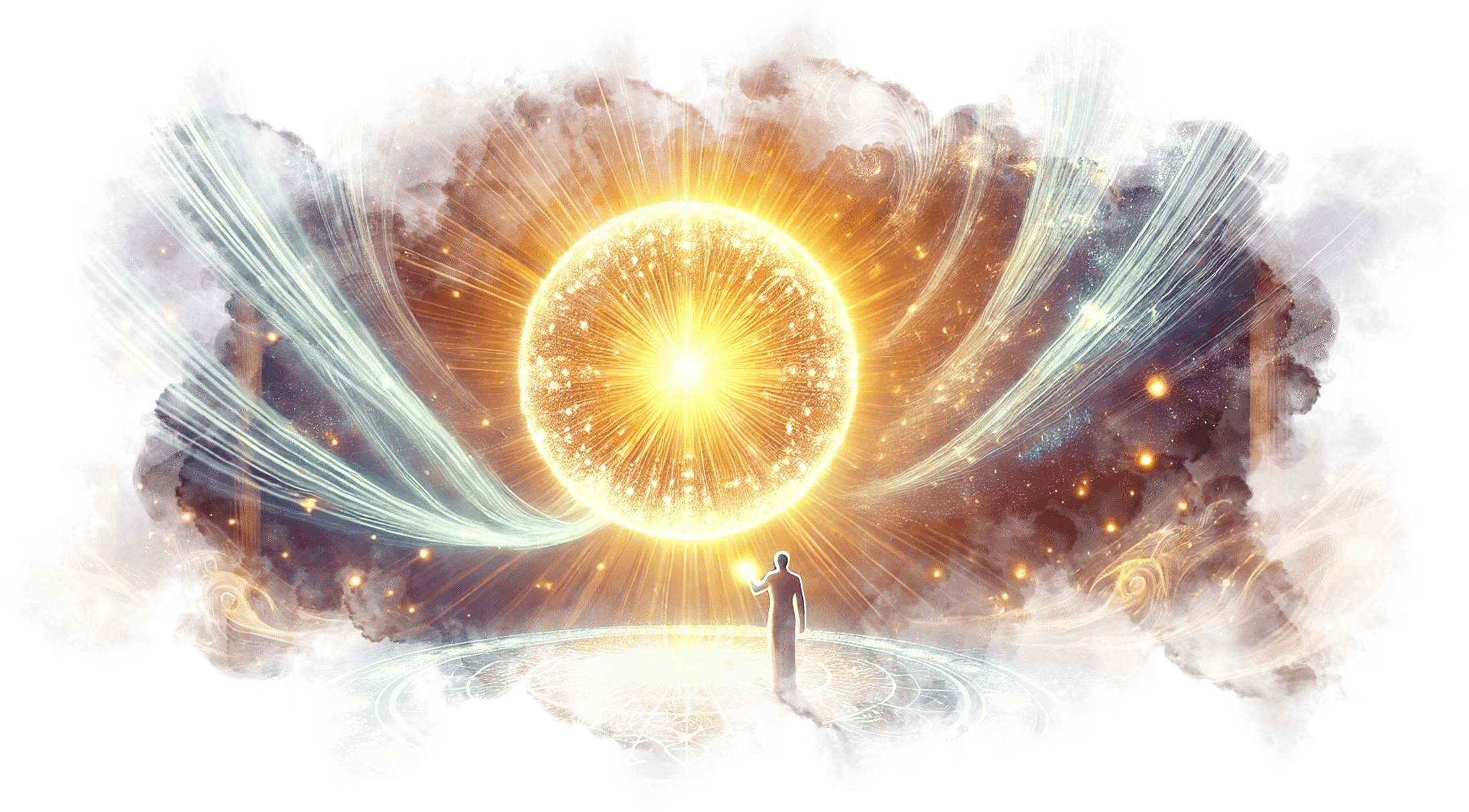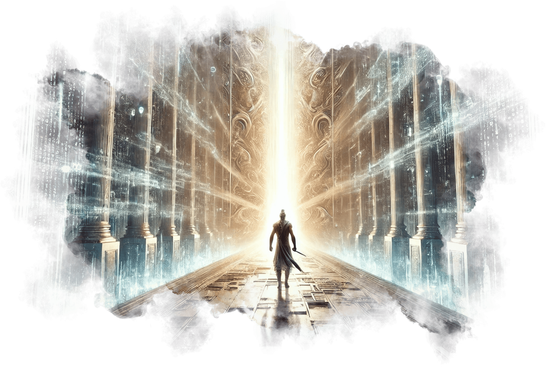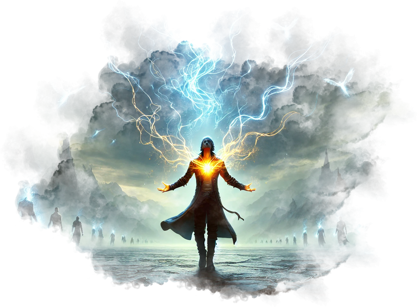 В его руках — Сфера Осознания, пульсирующая светом знания.
