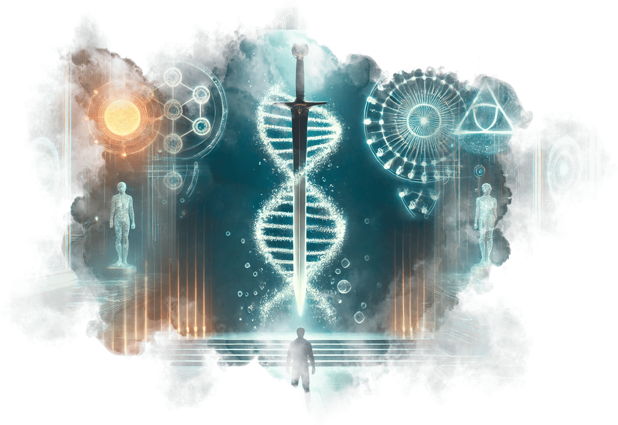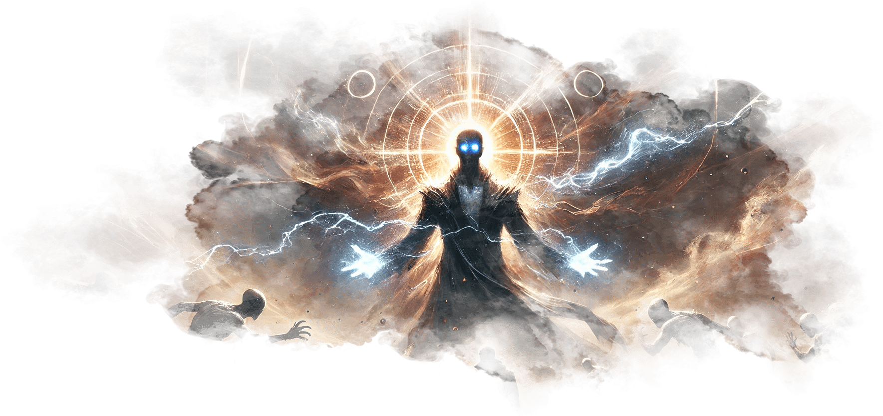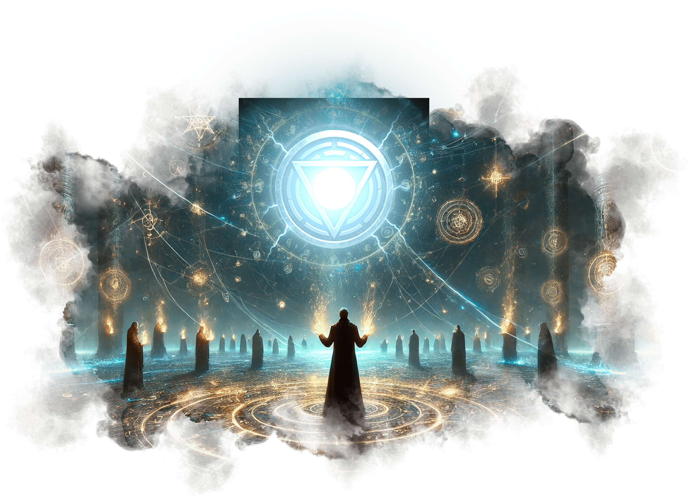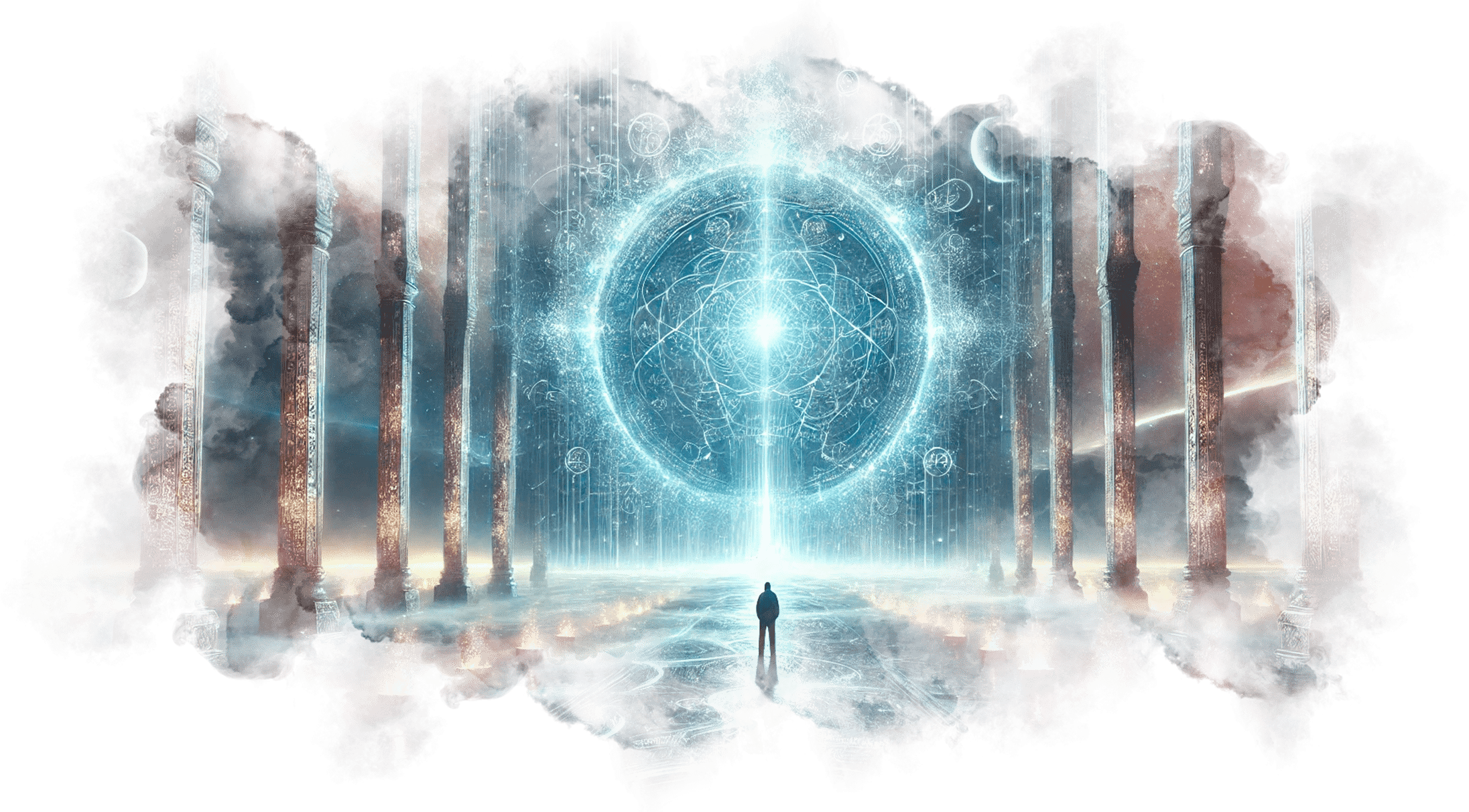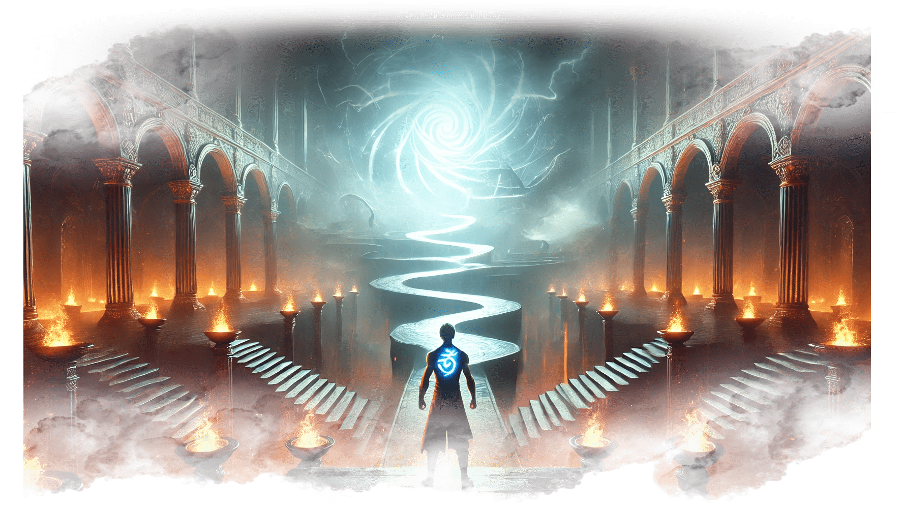 В его руках — Сфера Осознания, пульсирующая светом знания.