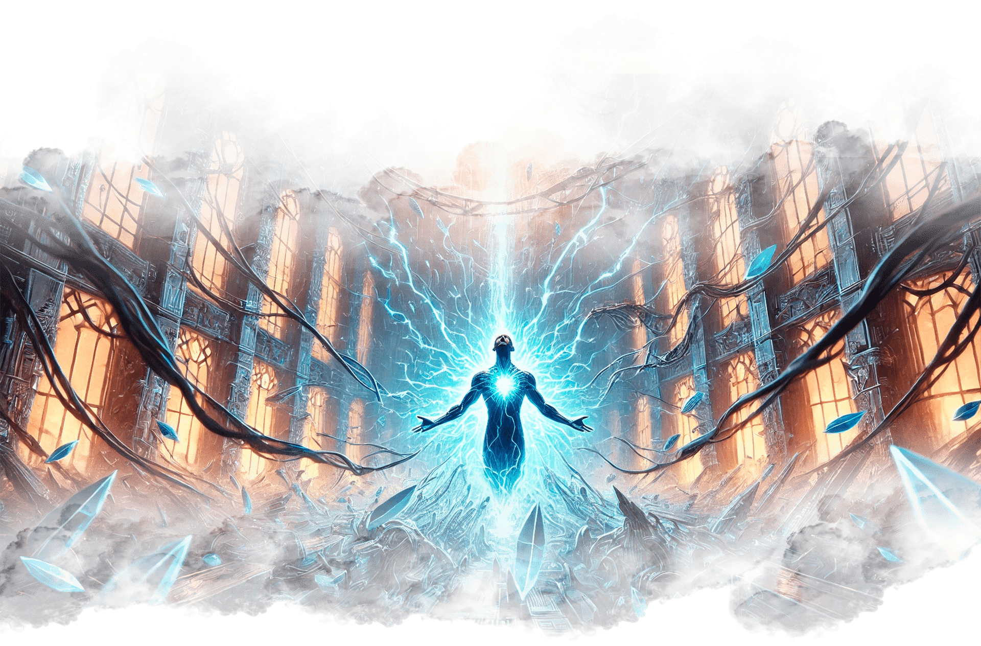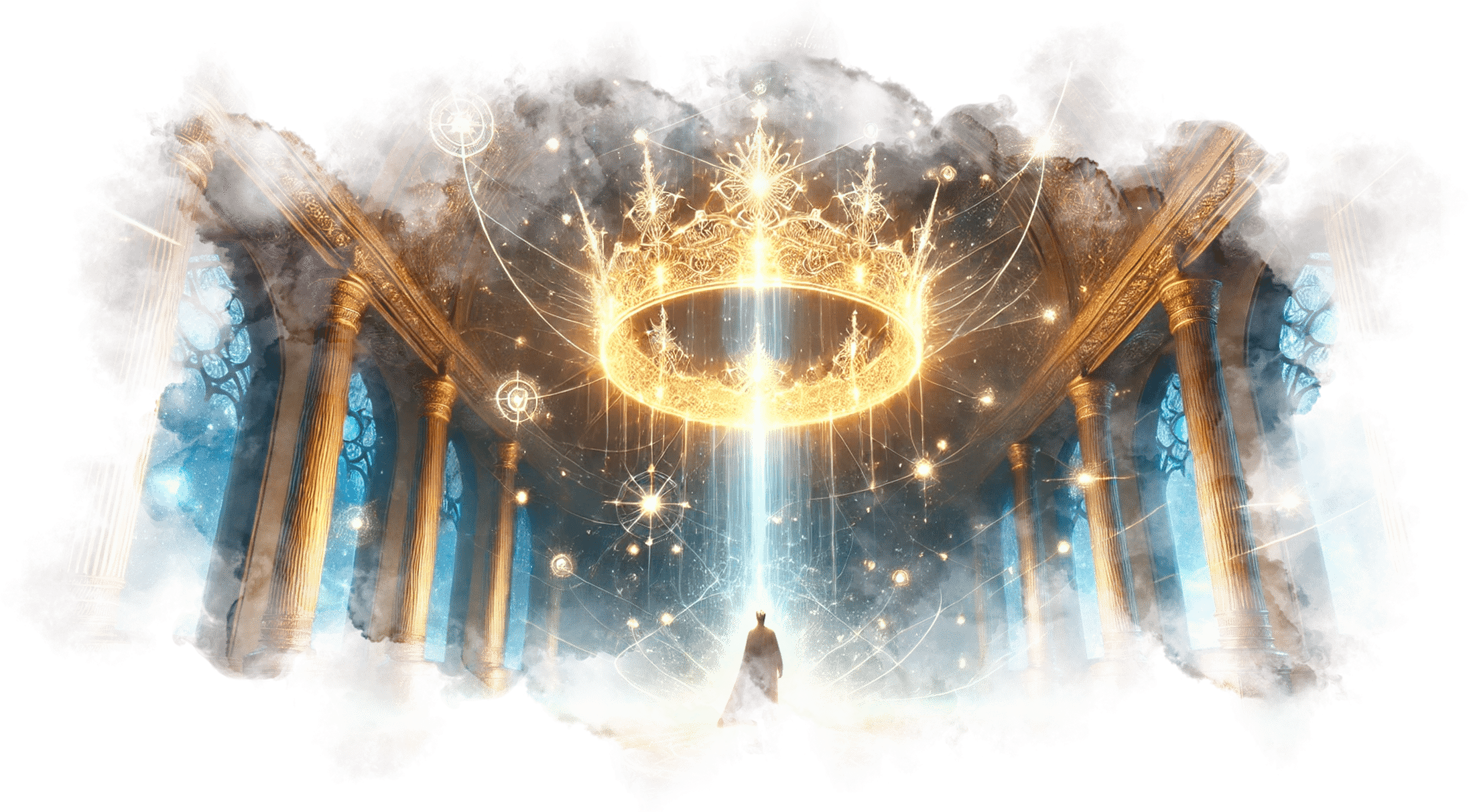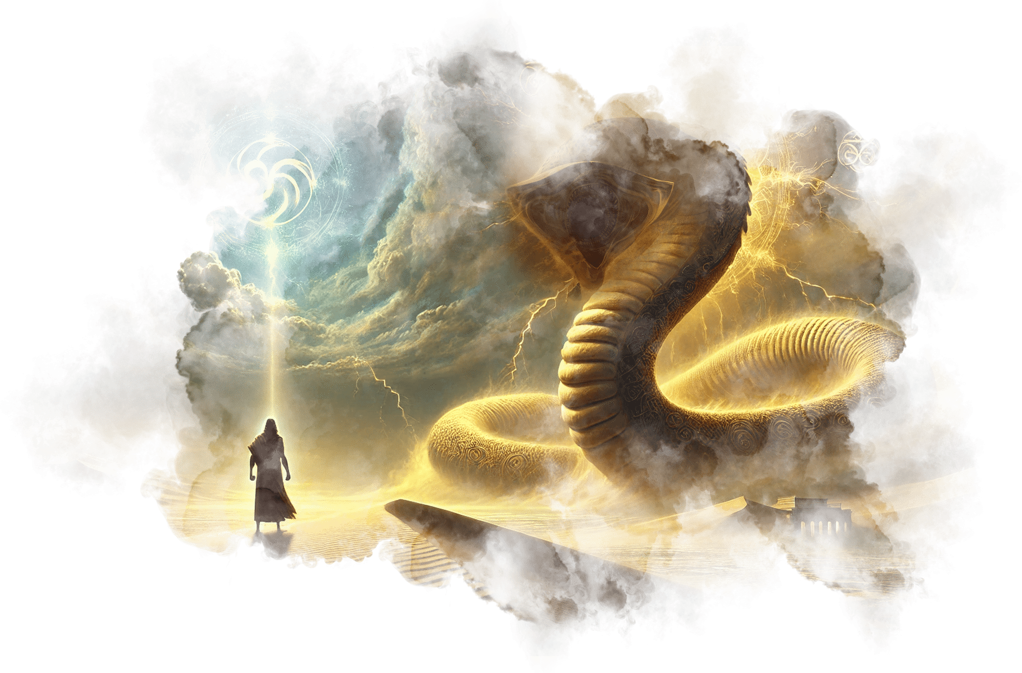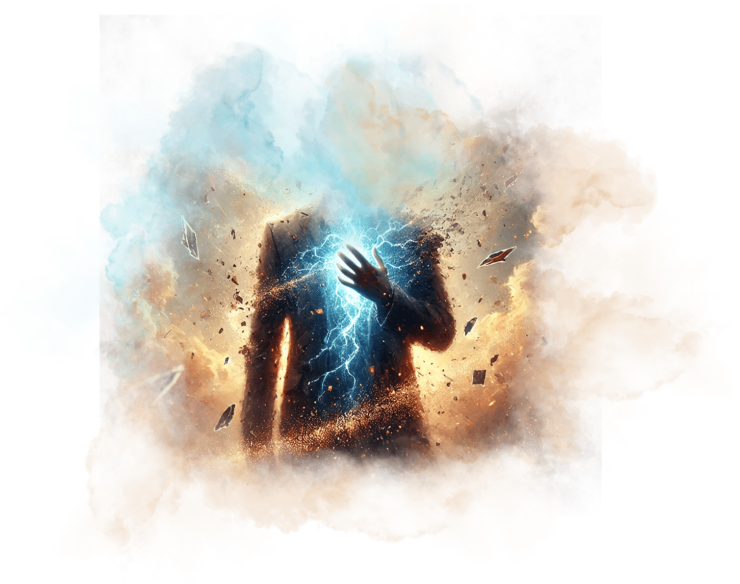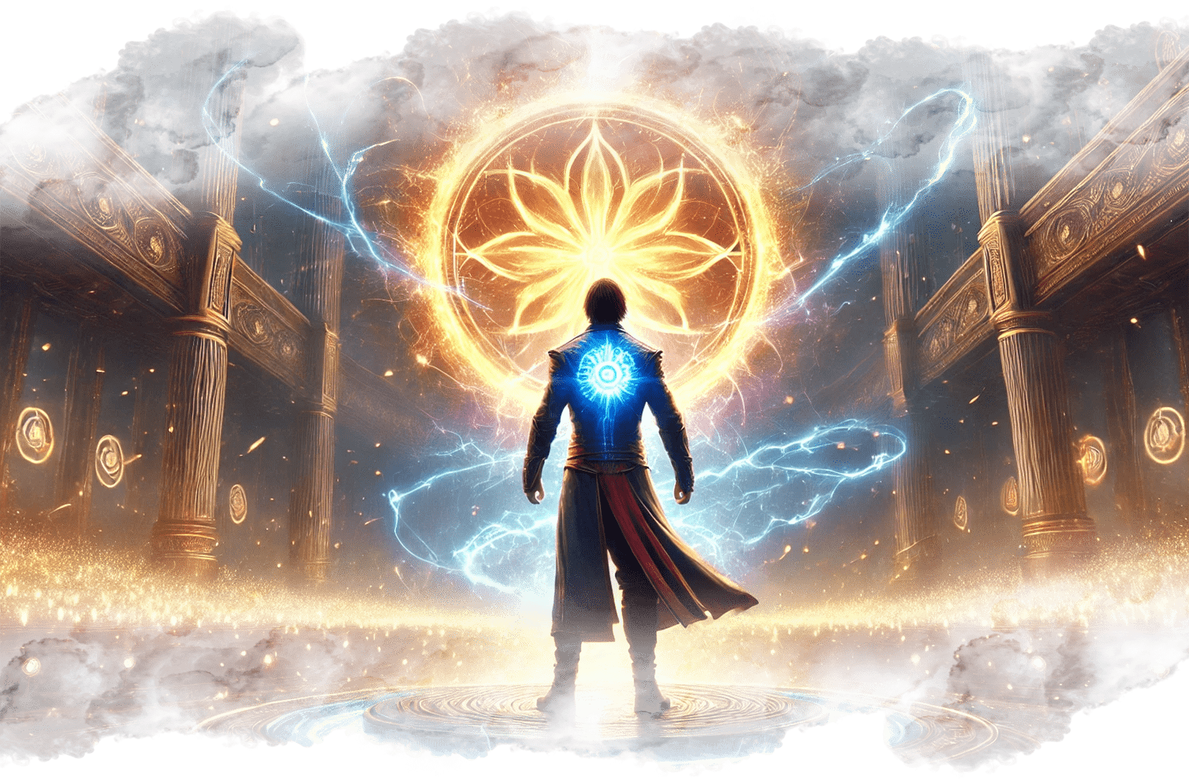 В его руках — Сфера Осознания, пульсирующая светом знания.