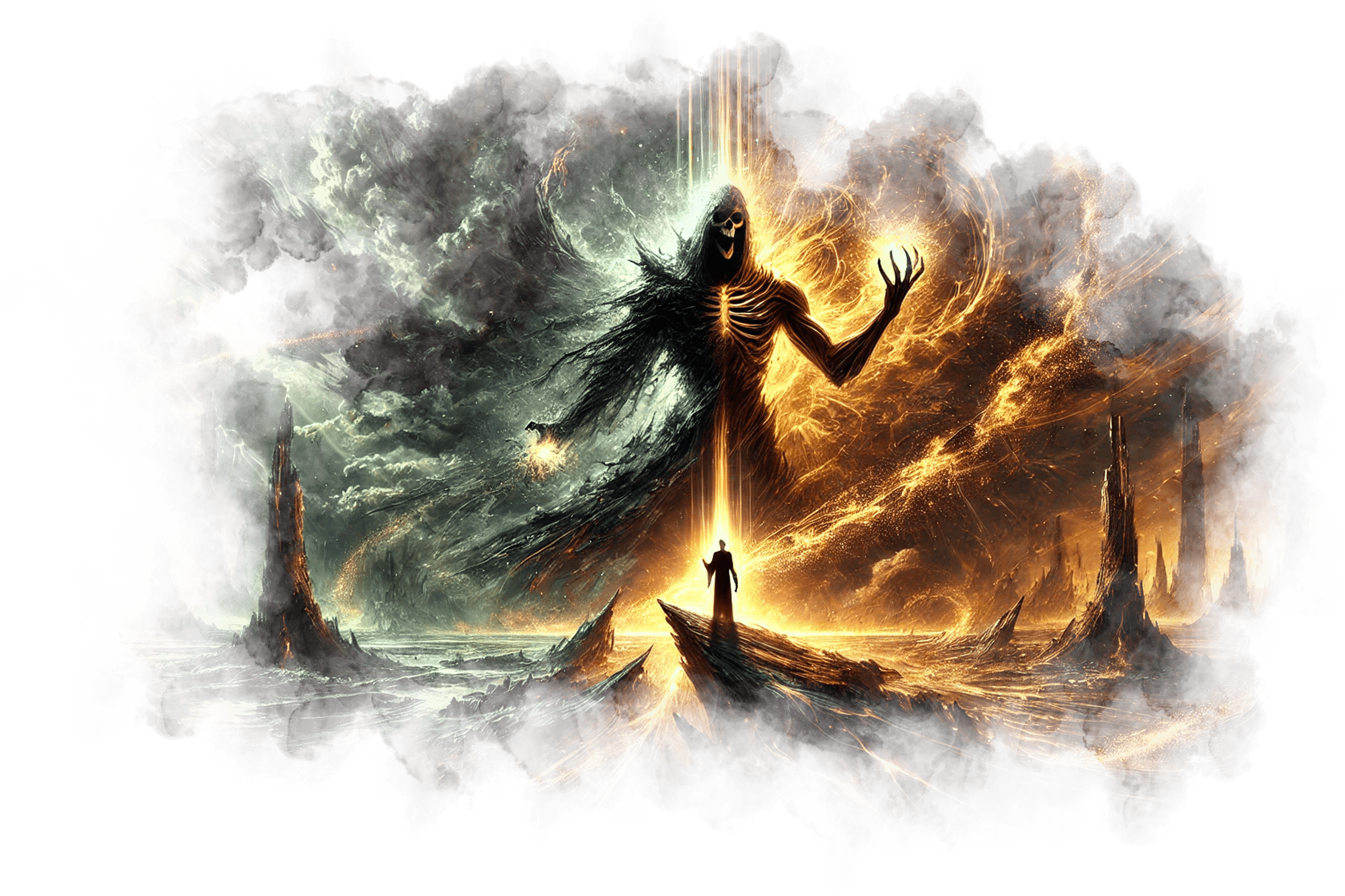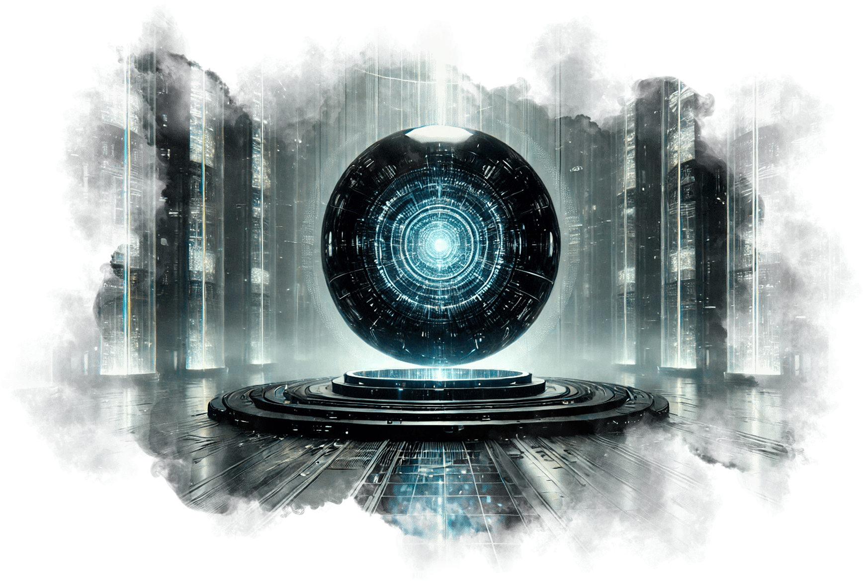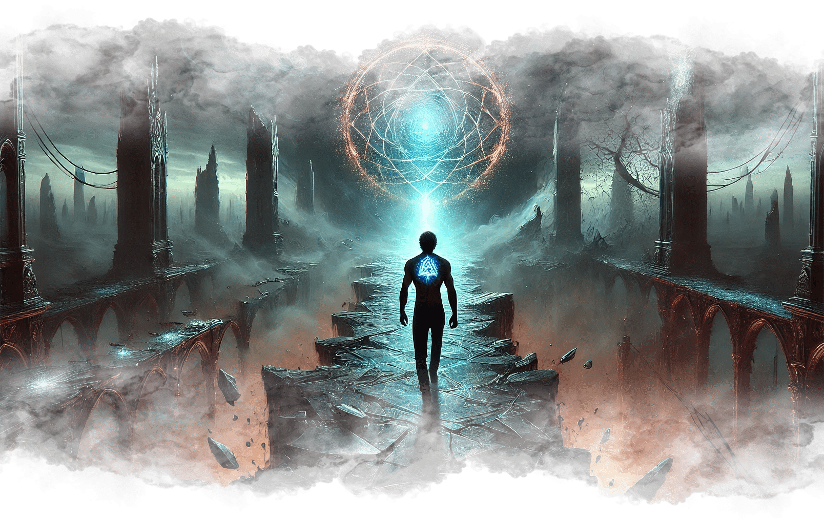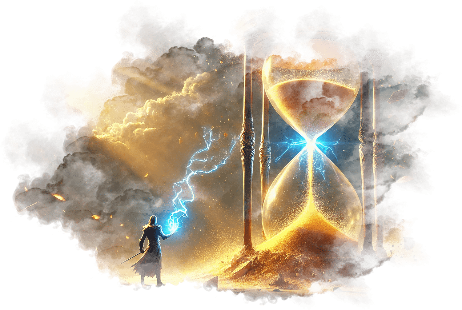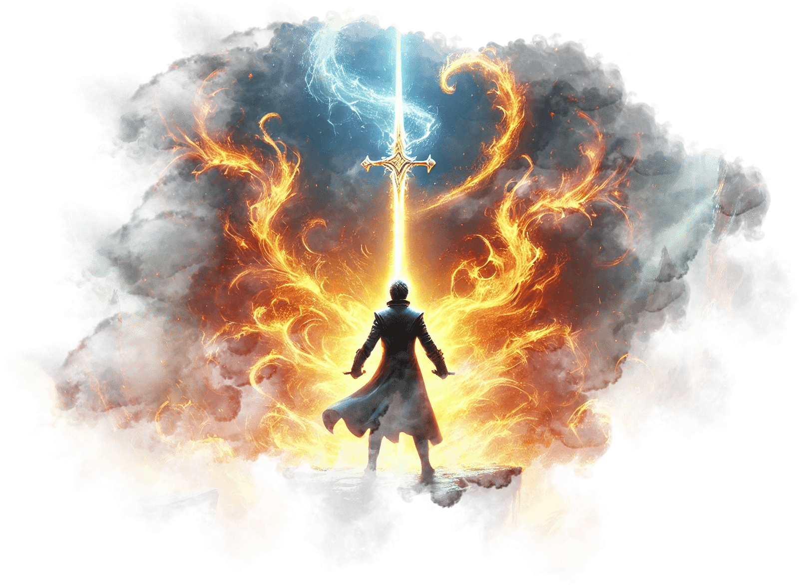 В его руках — Сфера Осознания, пульсирующая светом знания.