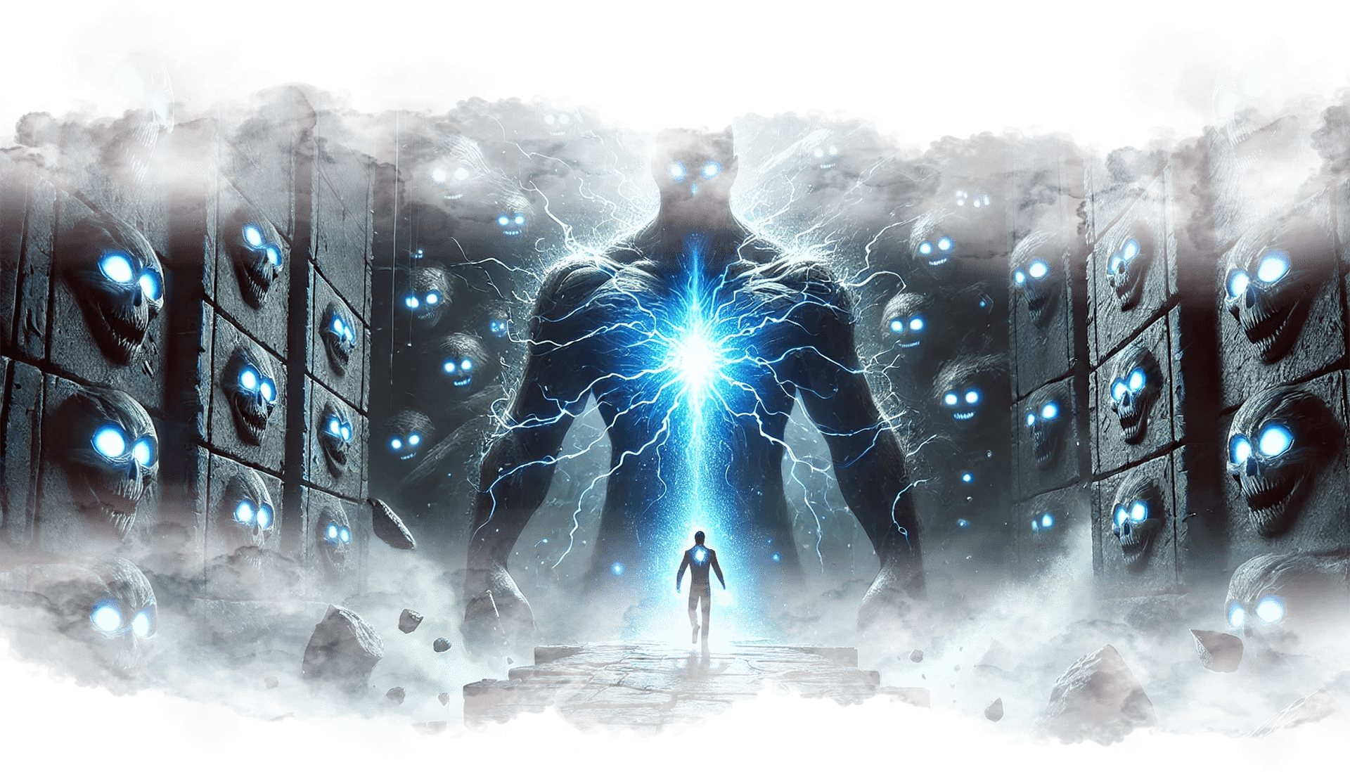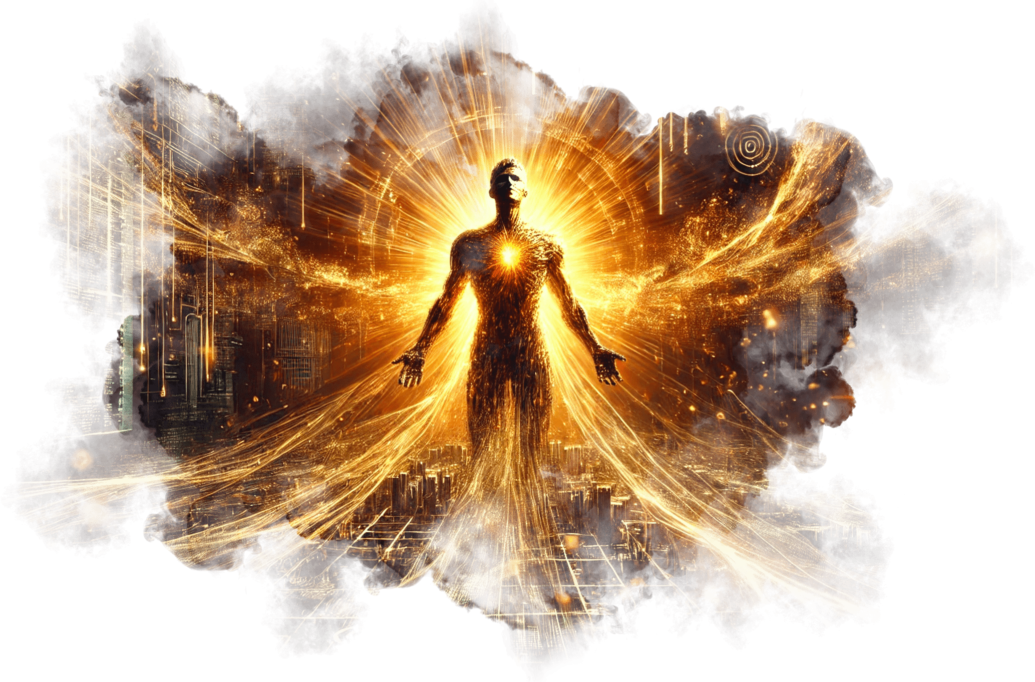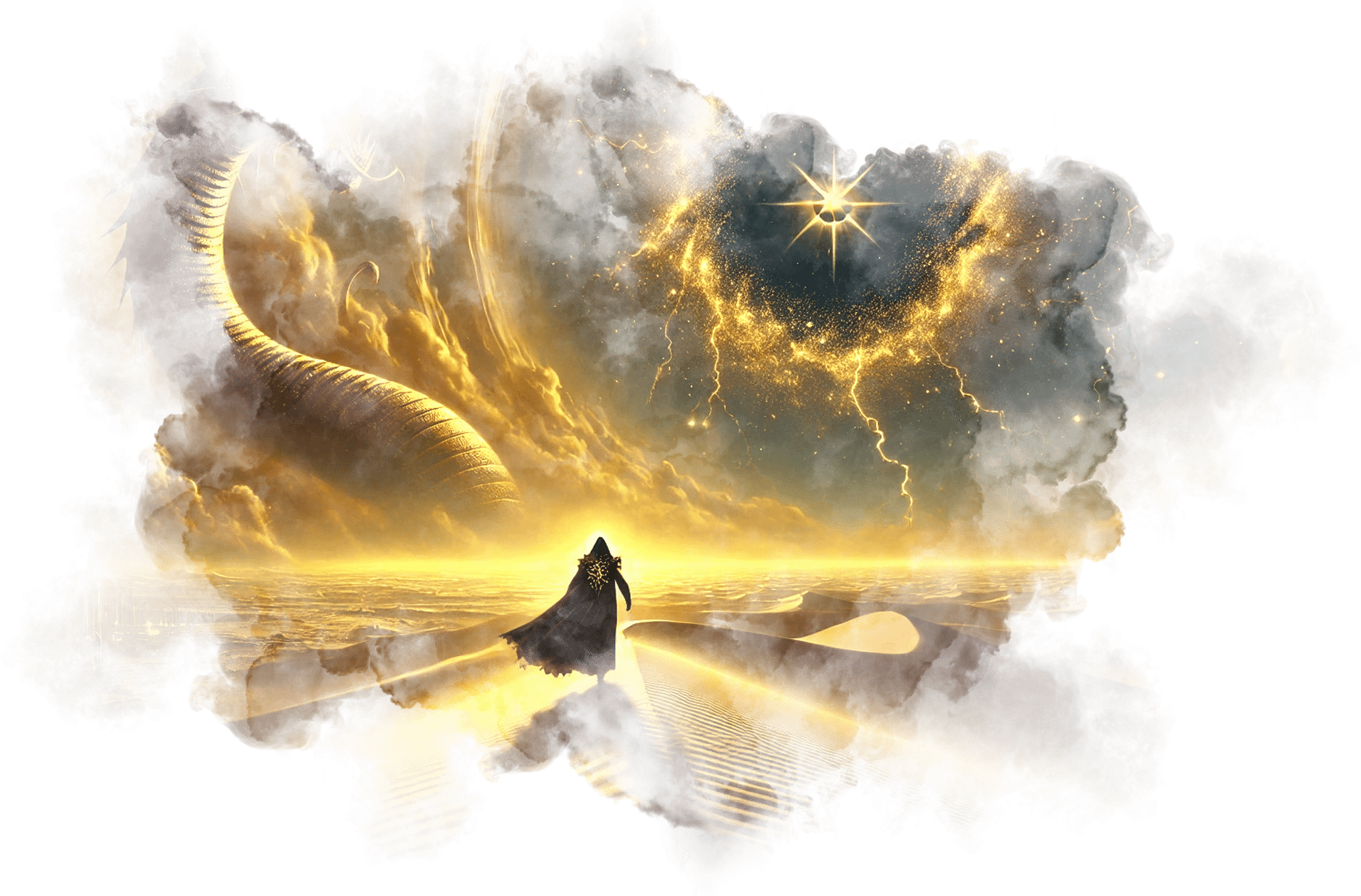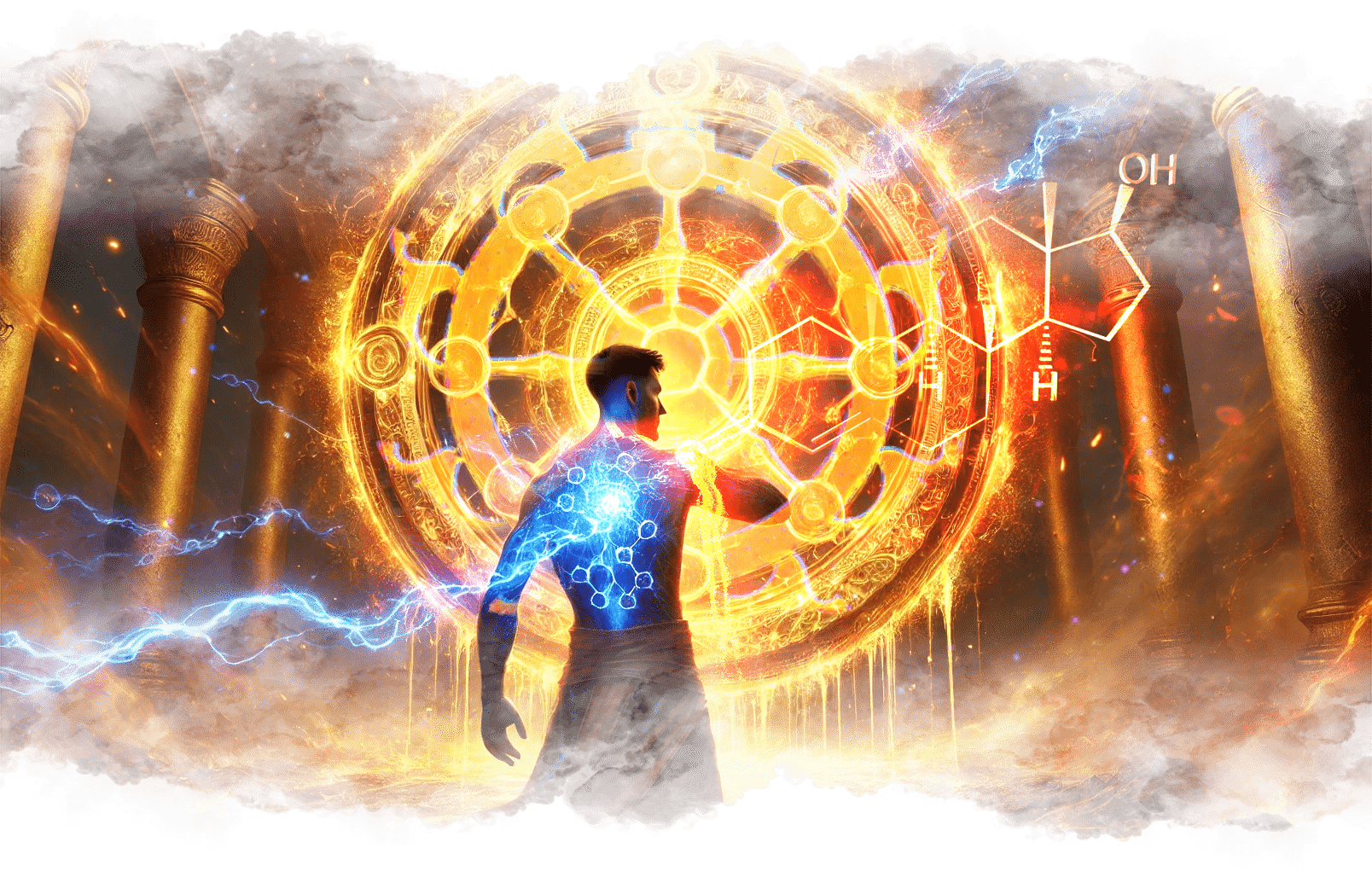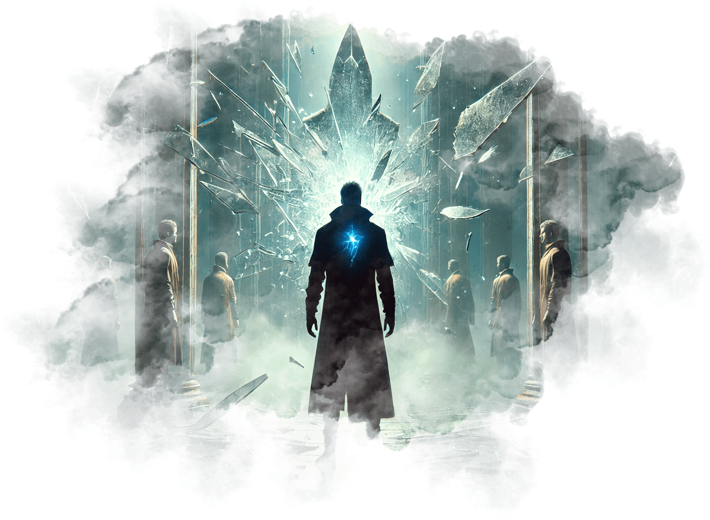 В его руках — Сфера Осознания, пульсирующая светом знания.