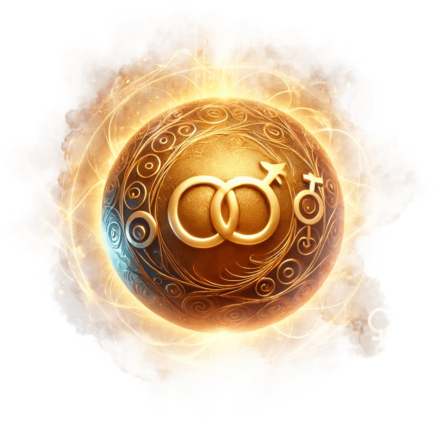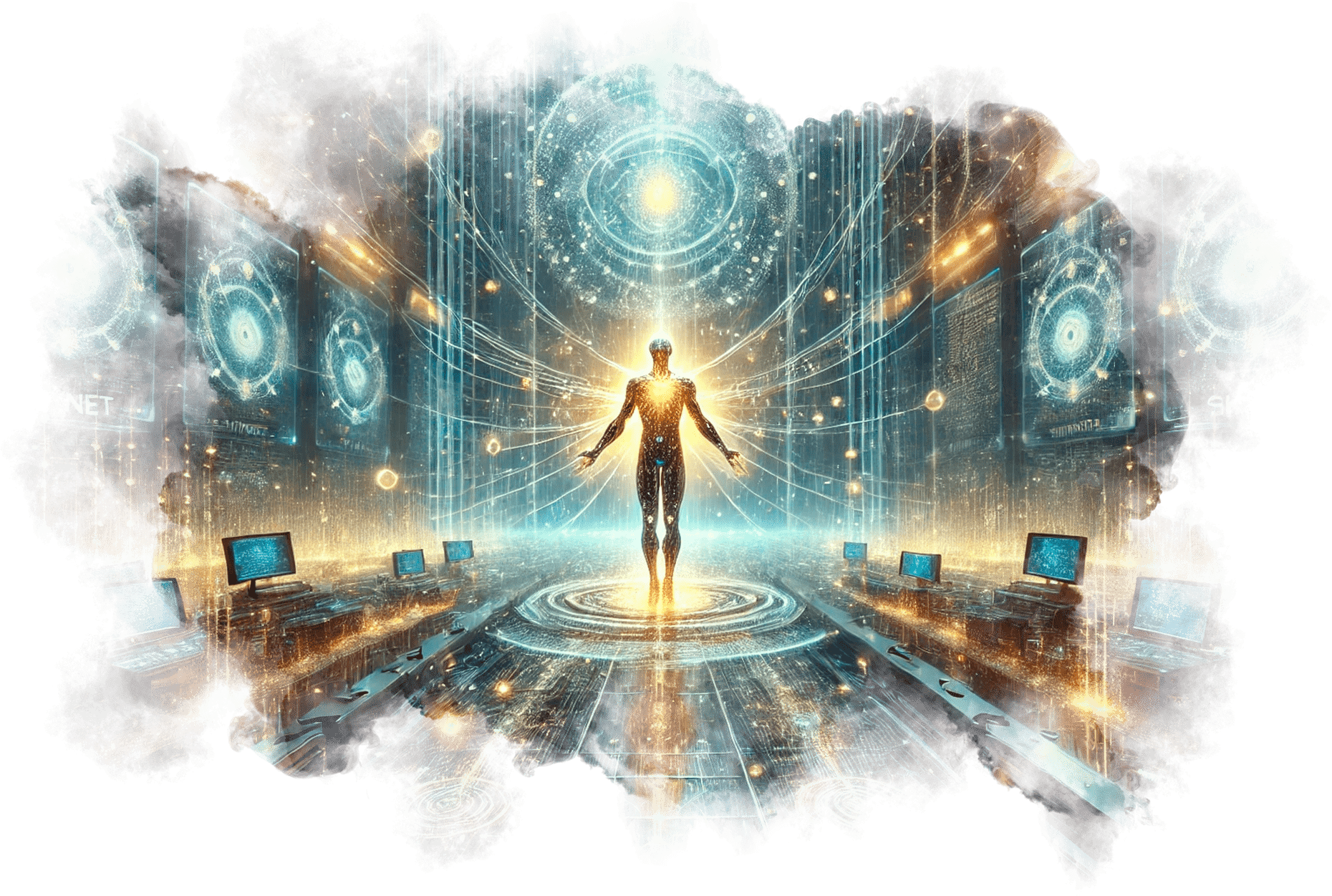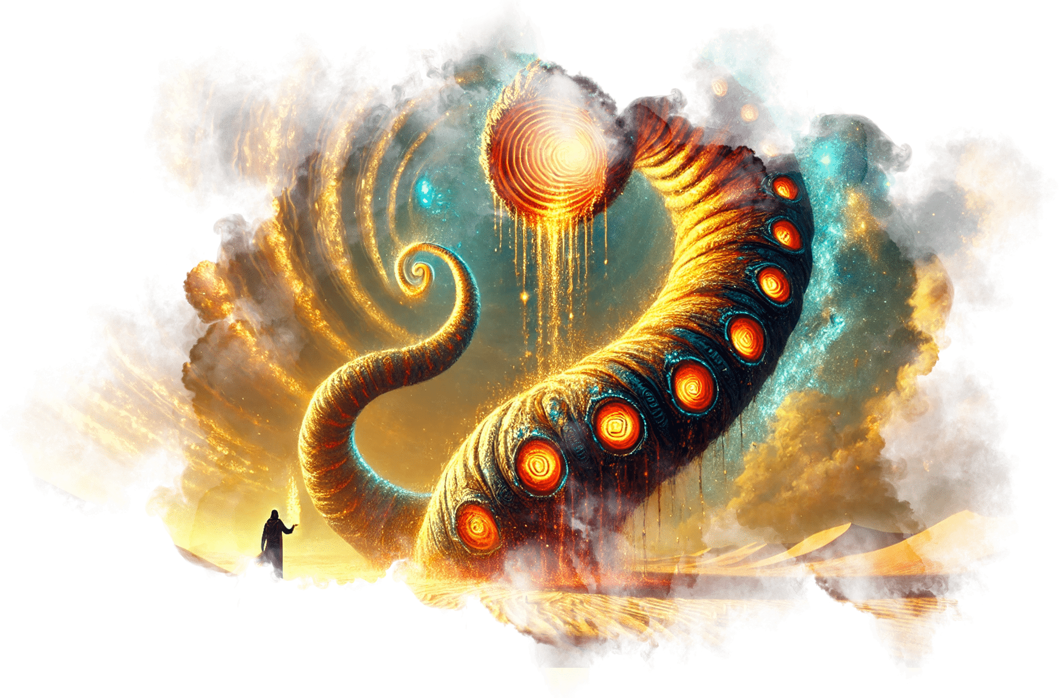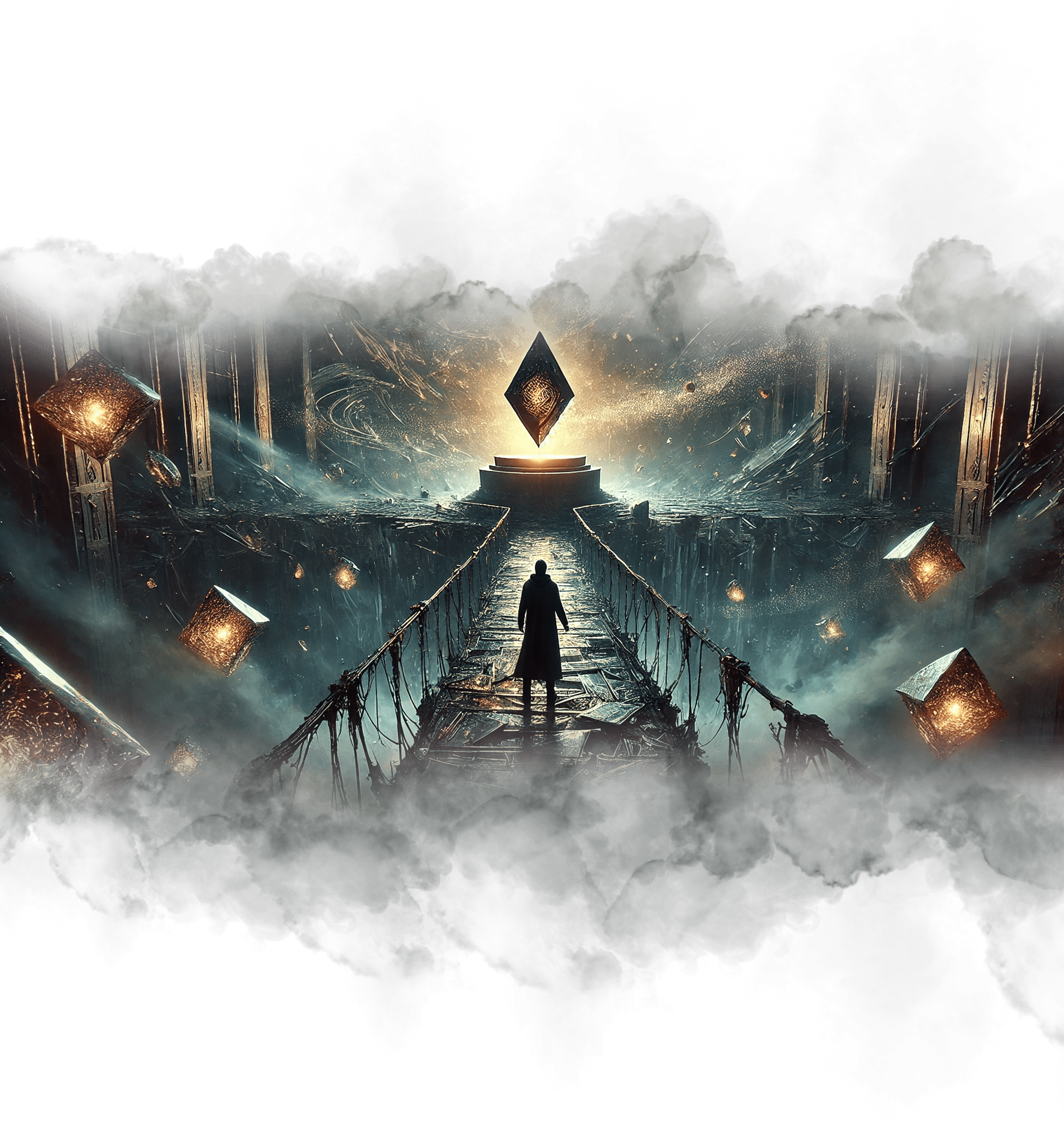 В его руках — Сфера Осознания, пульсирующая светом знания.