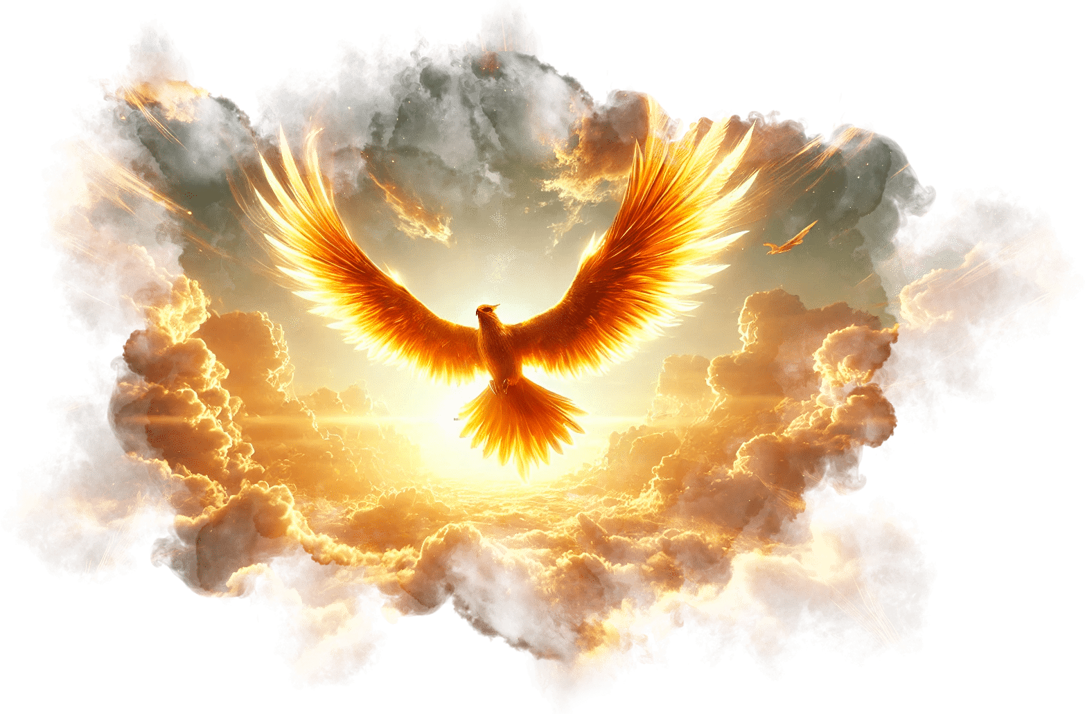 Он парит над облаками, его крылья сияют золотом.
