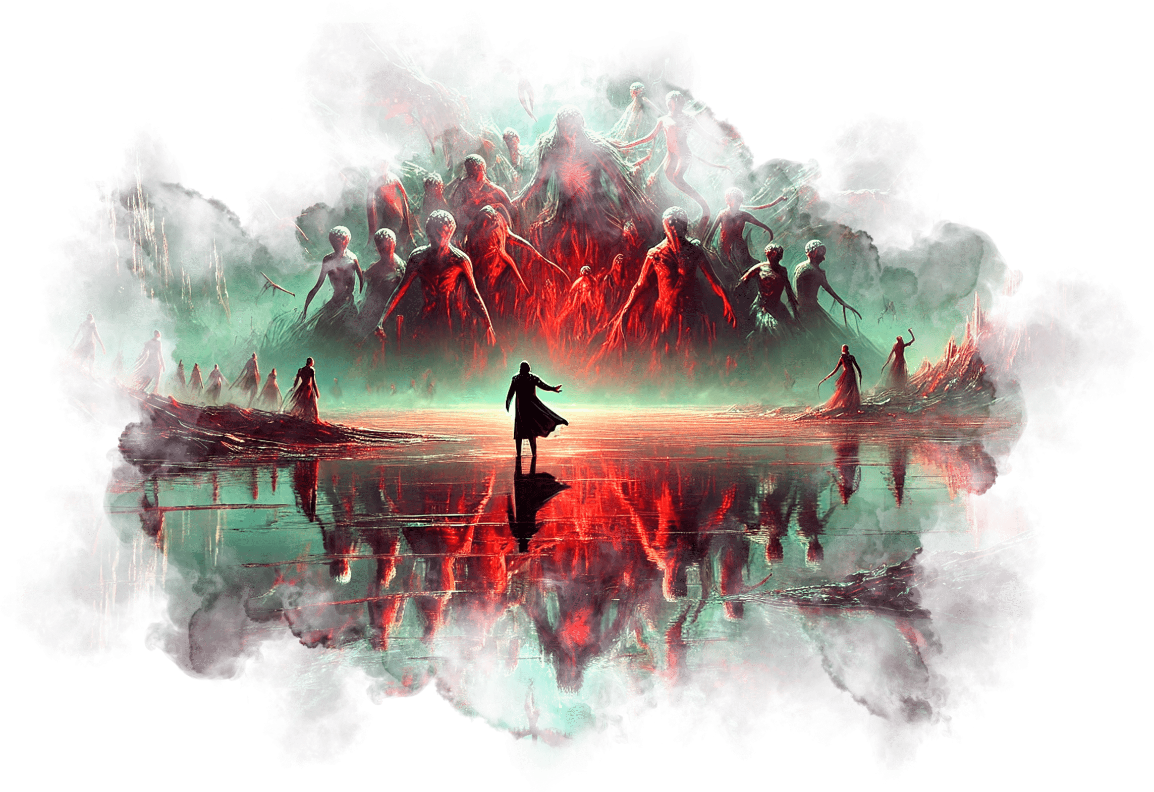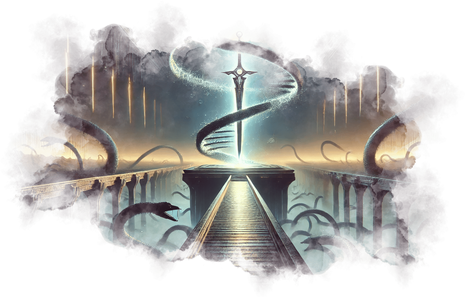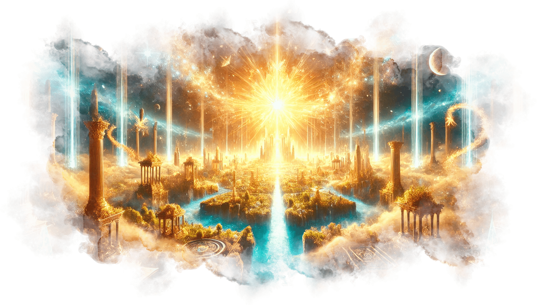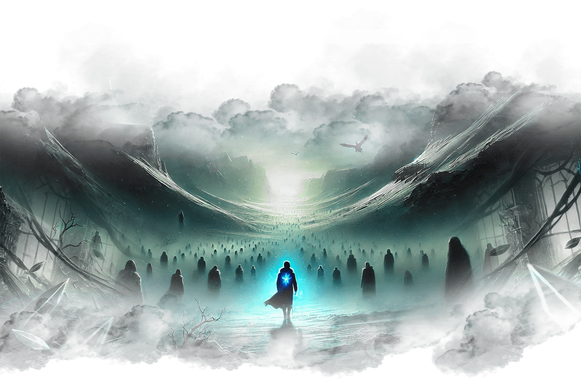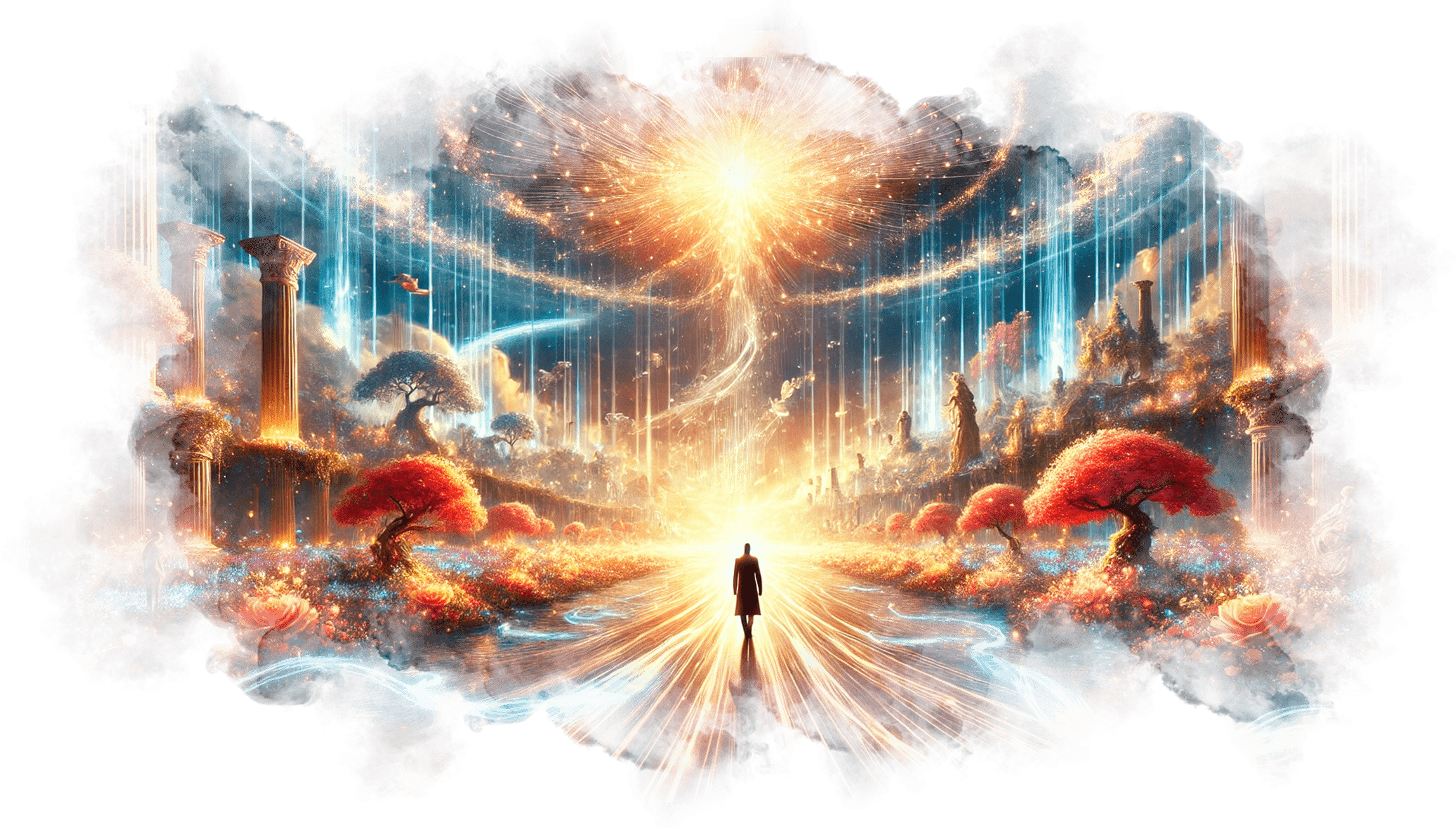 Андрей шагает вперёд, оставляя за собой следы света. Вокруг него растут сады Элизиума, а голоса людей, которым он показал путь, сливаются в симфонию света.