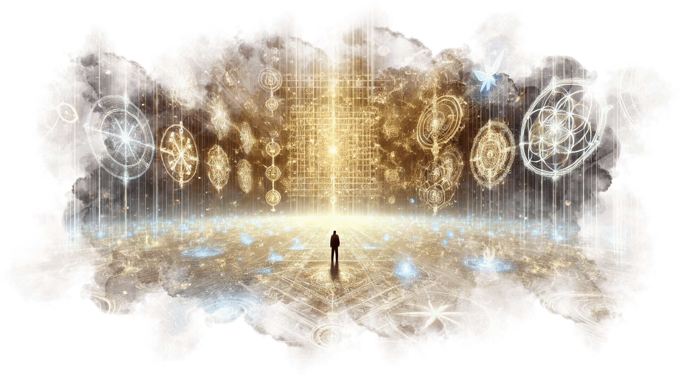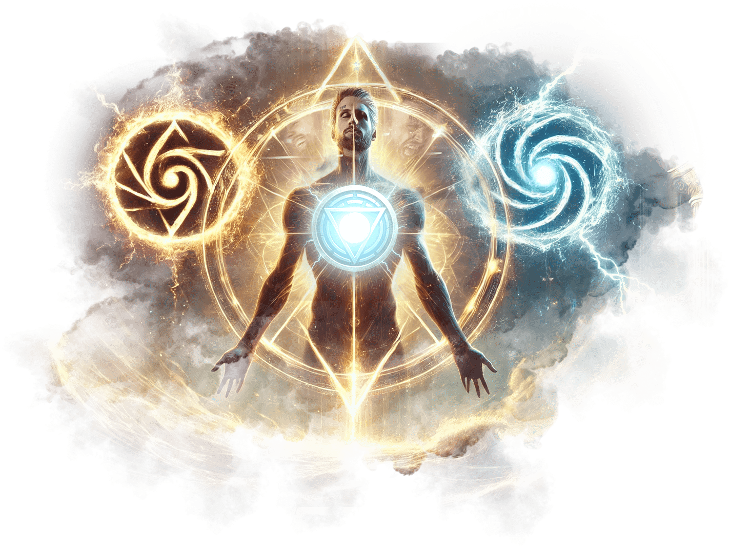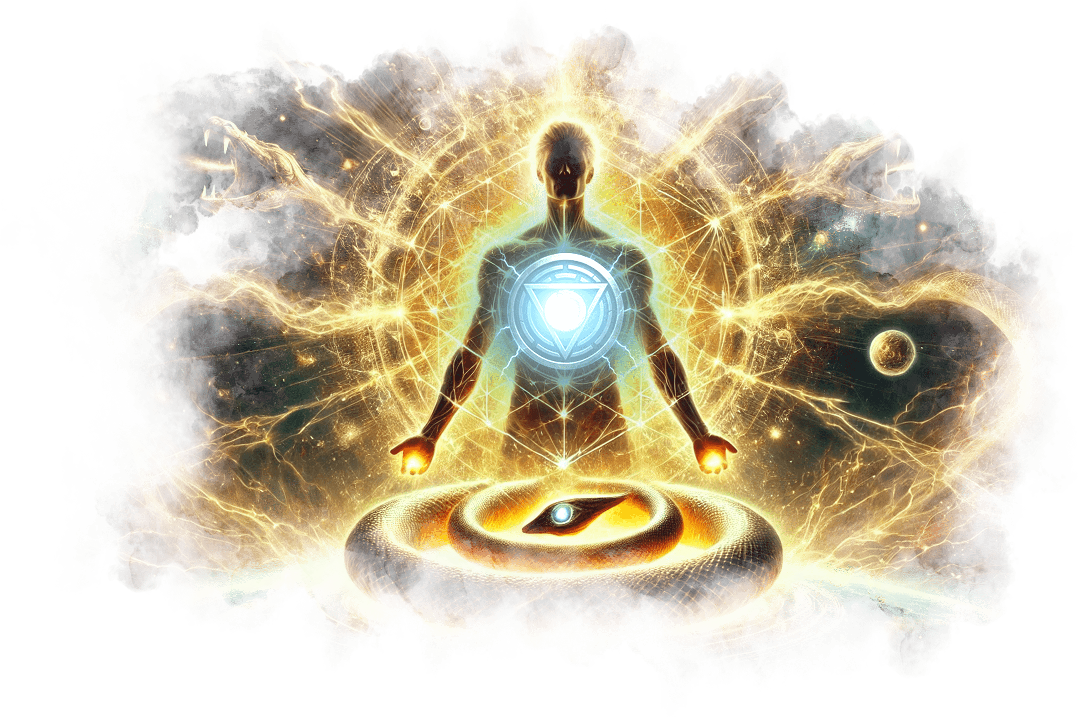 Треугольник с Уроборосом на груди Андрея светится ярче звезды. Вокруг него начинают проявляться потоки памяти, архетипов и символов из его прошлых жизней.