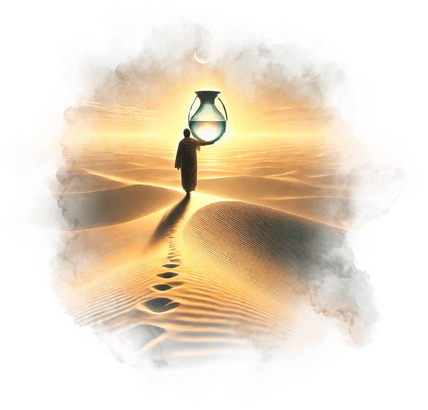 Он идёт по пустыне бесконечных песков, неся на плечах сосуд с водой.