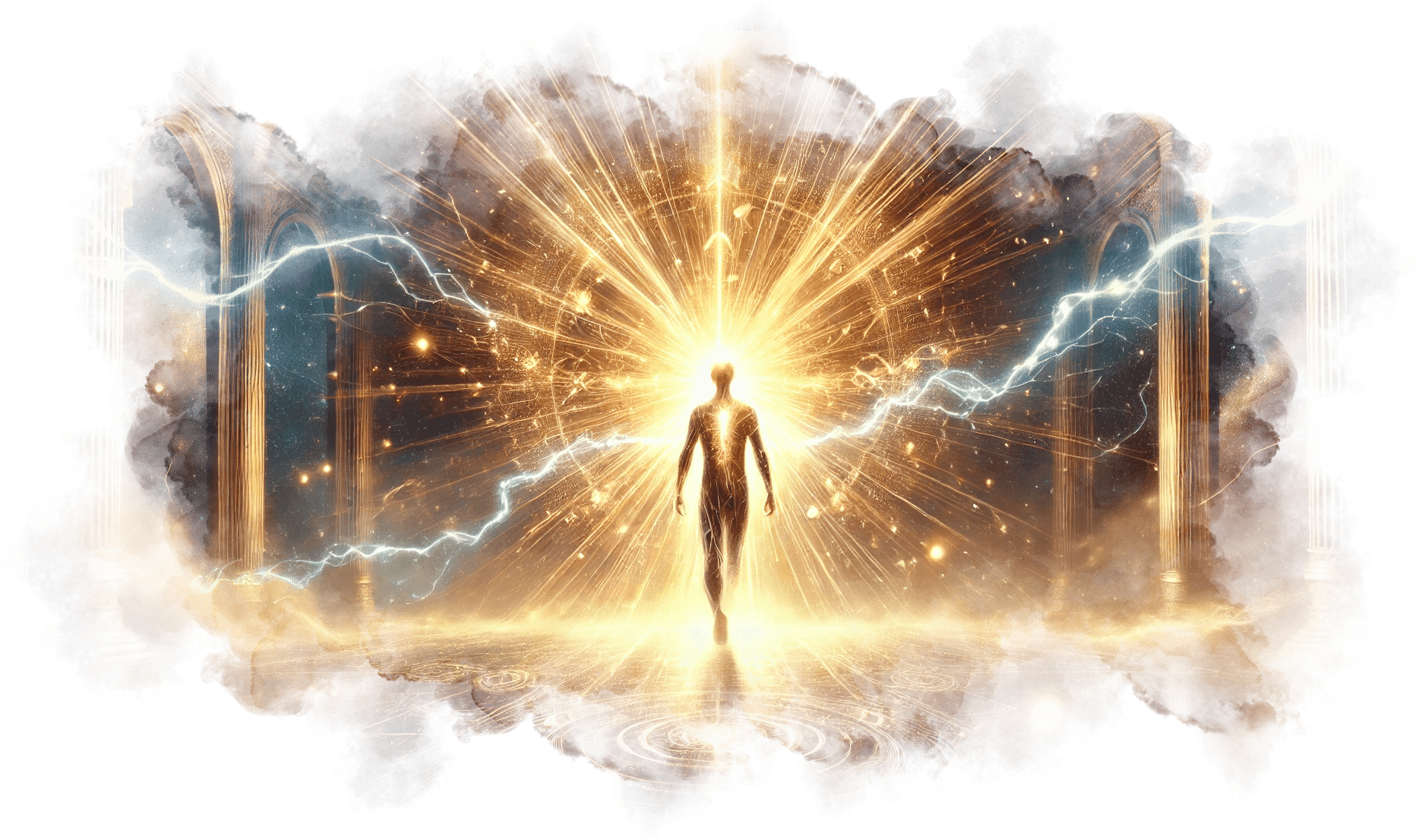 Андрей возвращается в мир. Вокруг него золотой свет, а его взгляд сияет молниями.