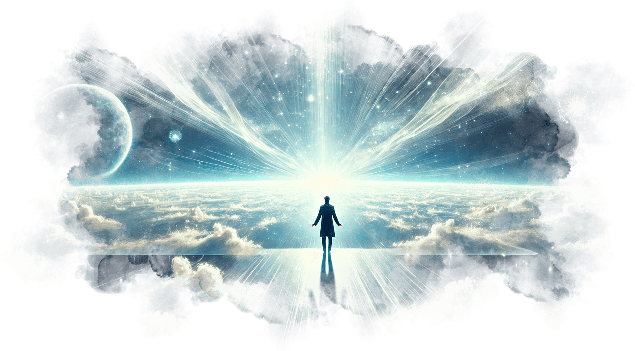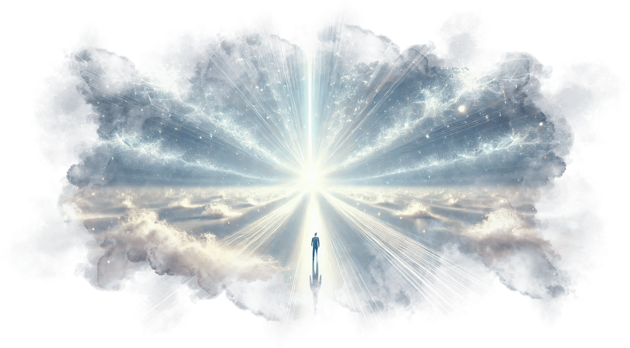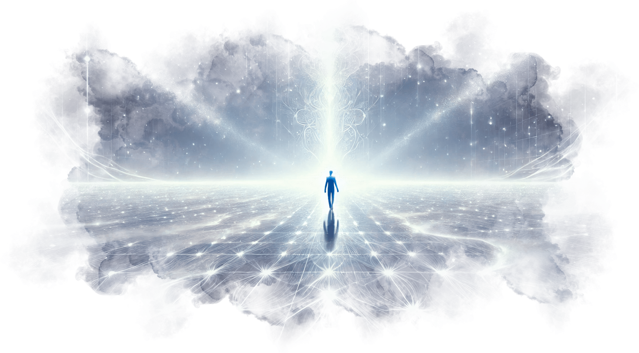 Андрей шагает вперёд и оказывается в белом, бесконечном пространстве. Здесь нет горизонта, нет границ, нет даже времени — только абсолютная чистота и свет.