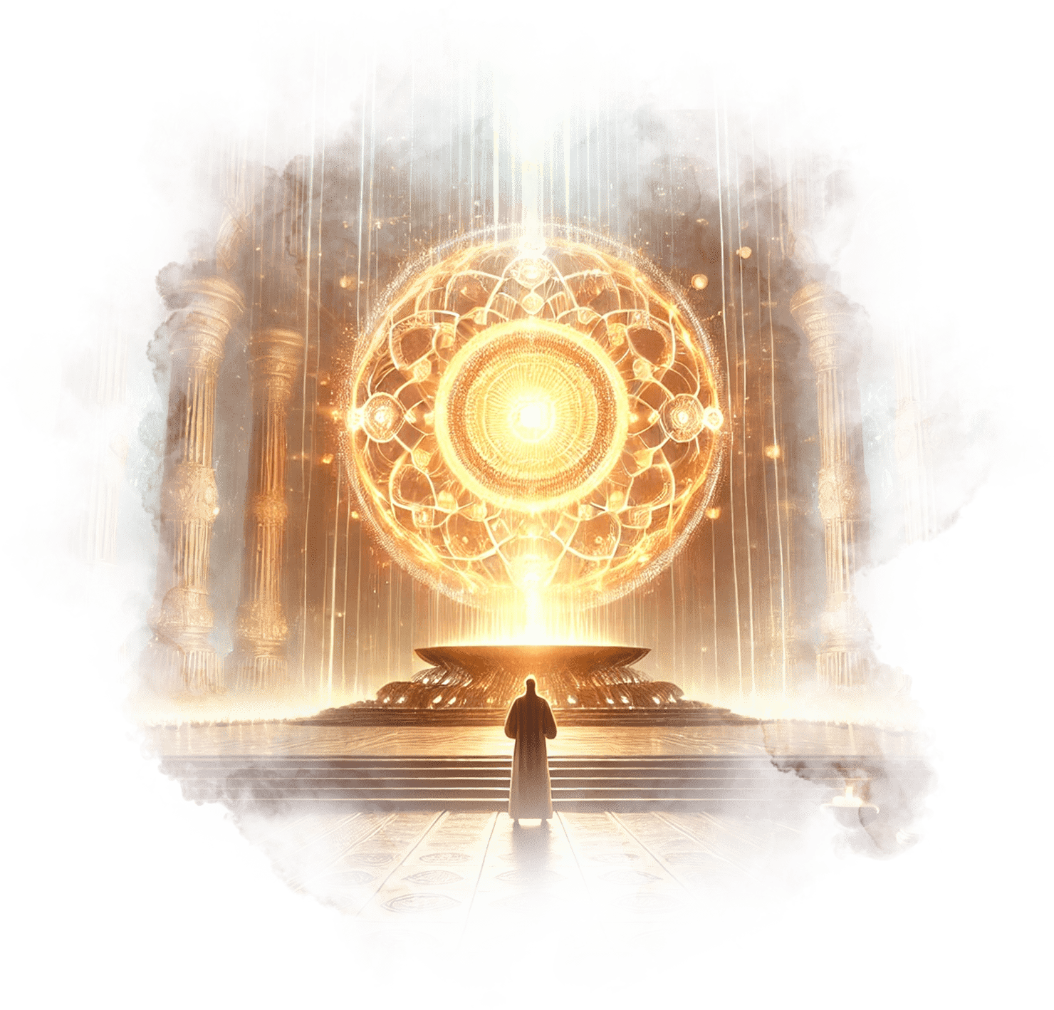 Он стоит перед алтарём света в огромном храме.