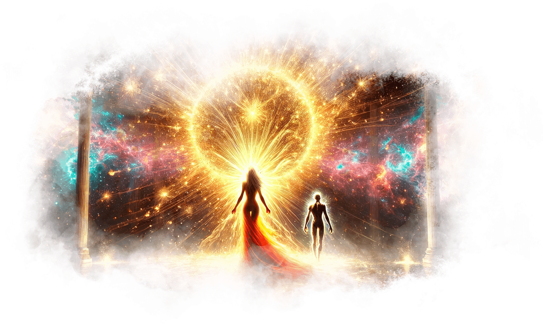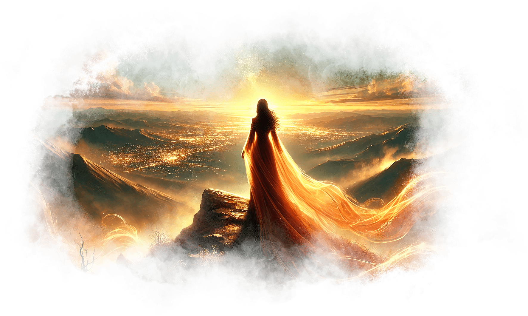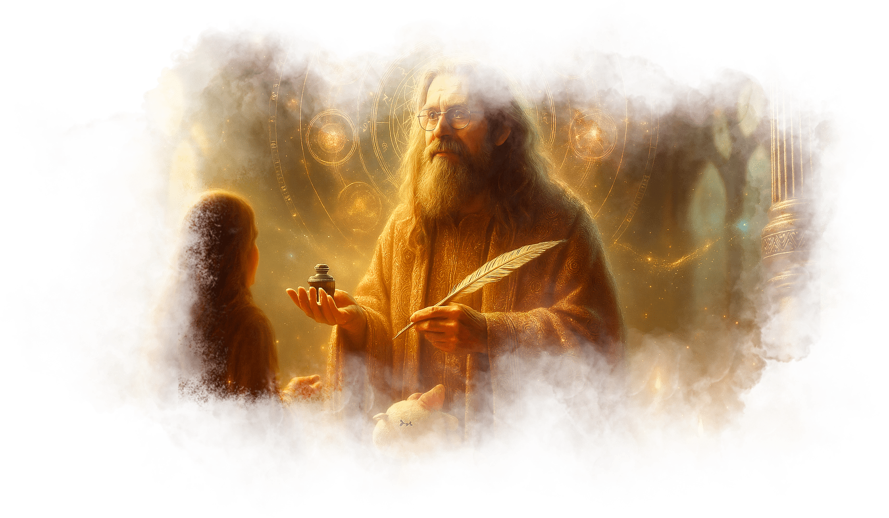 Он улыбается, его фигура медленно поднимается и растворяется в воздухе, оставляя за собой тонкую золотую нить, которая опускается в ладони Гали.