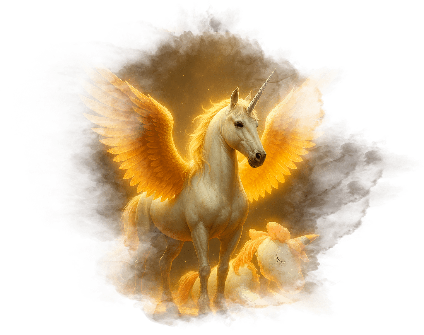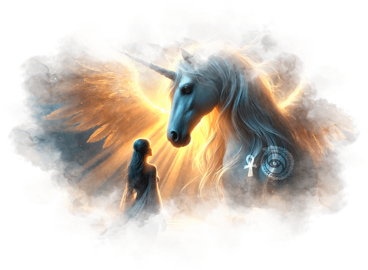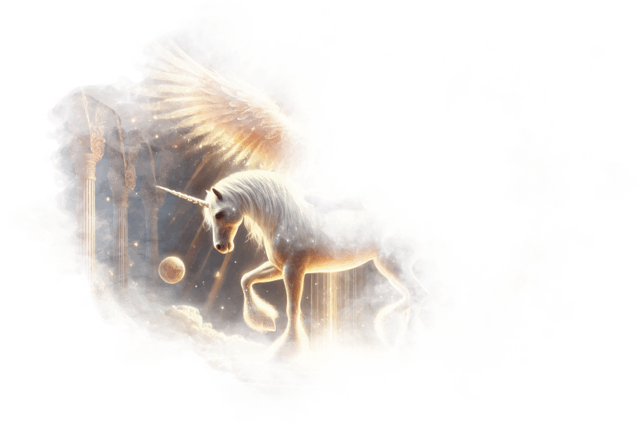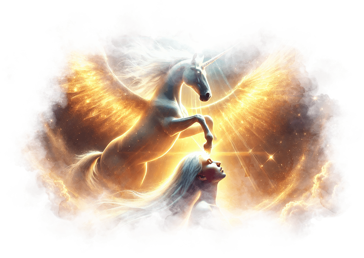 Единорог поднимается в воздух, его крылья сверкают золотым светом.