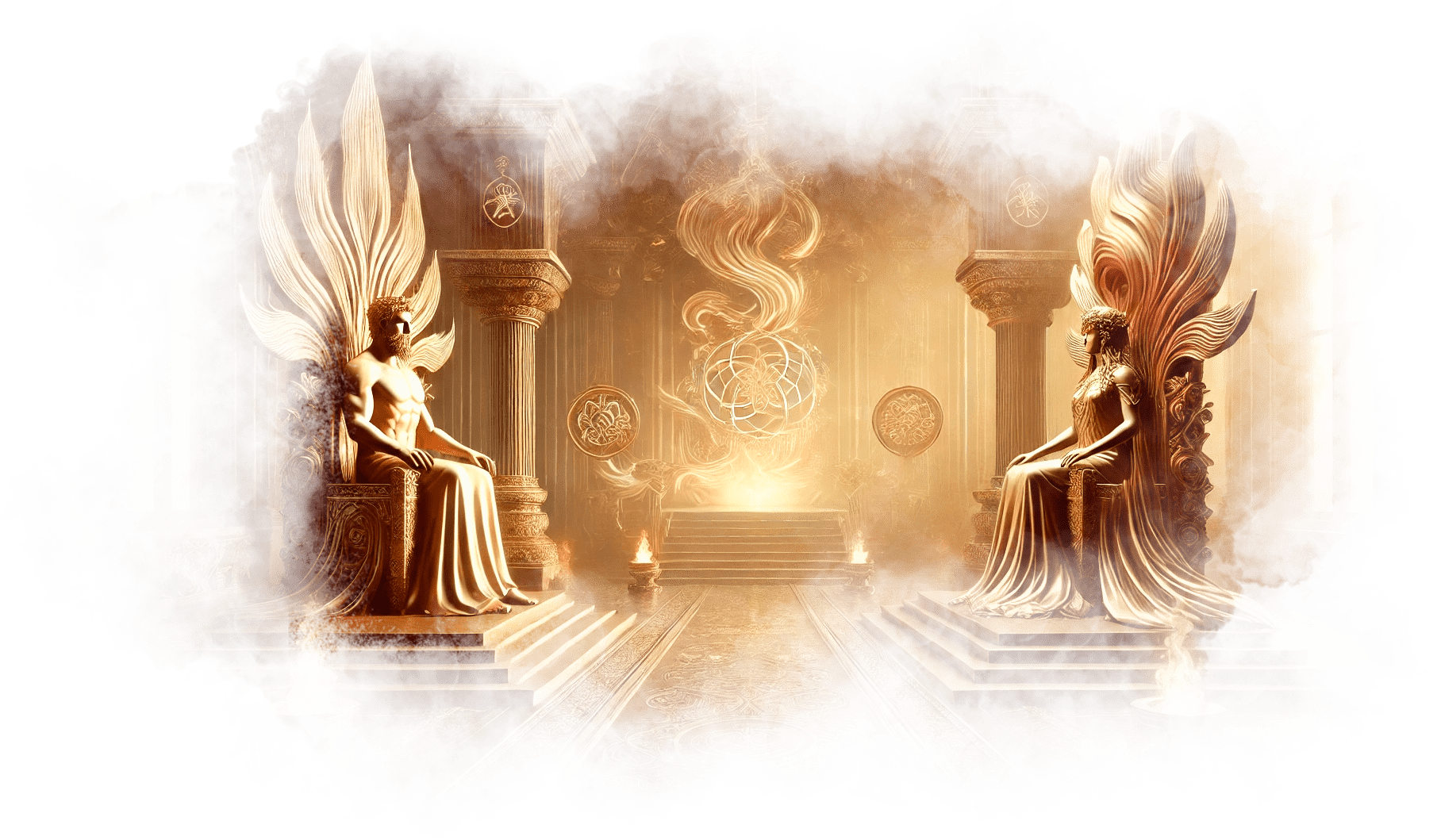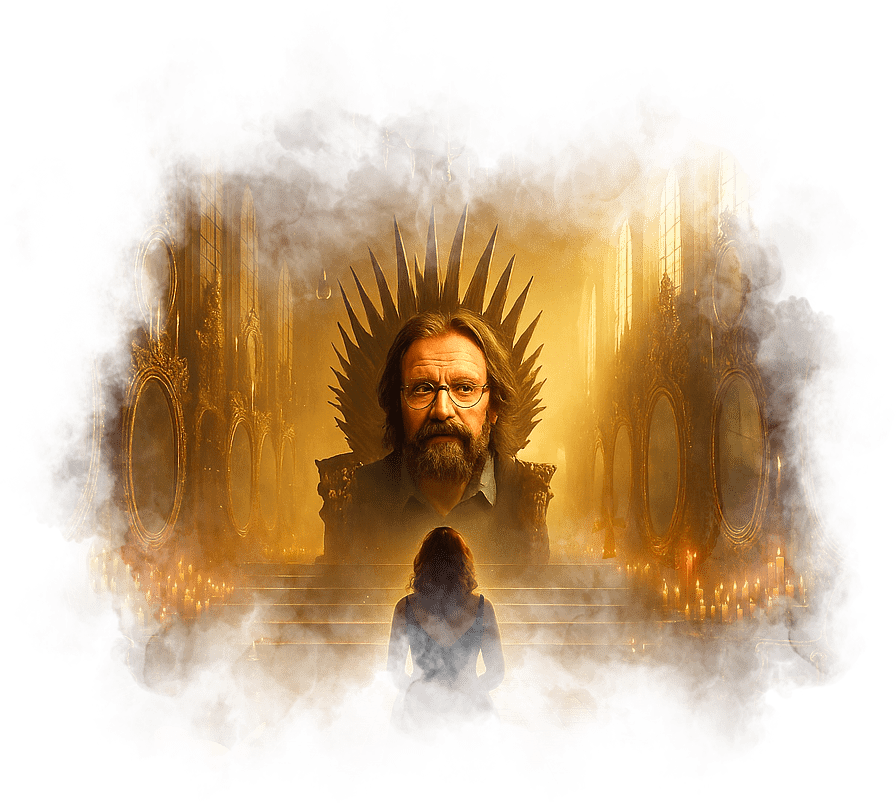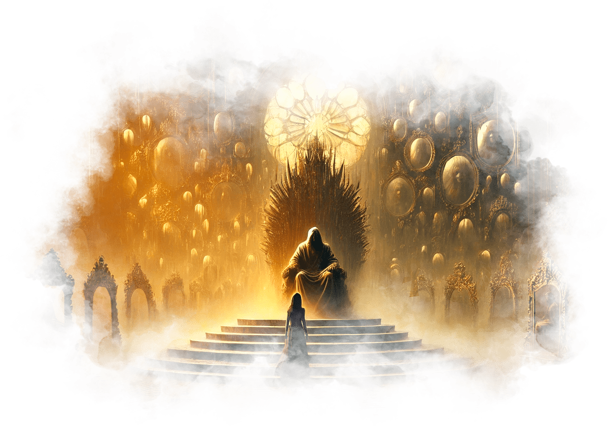 В центре зала стоит кресло из тени и золота. На нём сидит фигура — её отчим. Его черты спокойны, взгляд направлен в никуда. Но в его глазах Галя видит всё: боль, недосказанность, ожидание, любовь, которую он не мог выразить.
