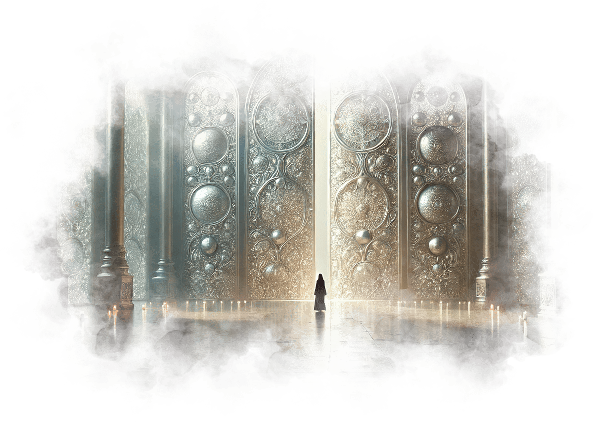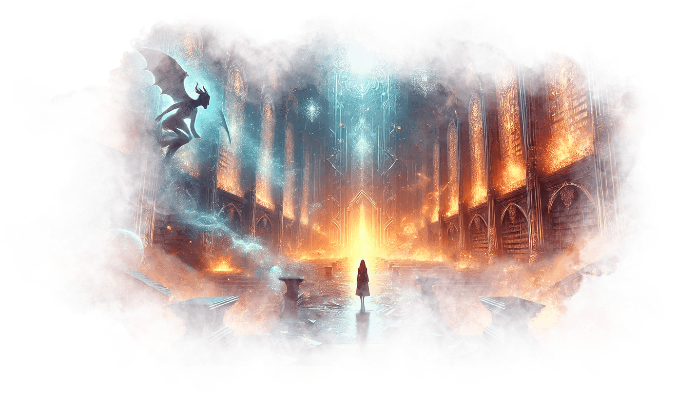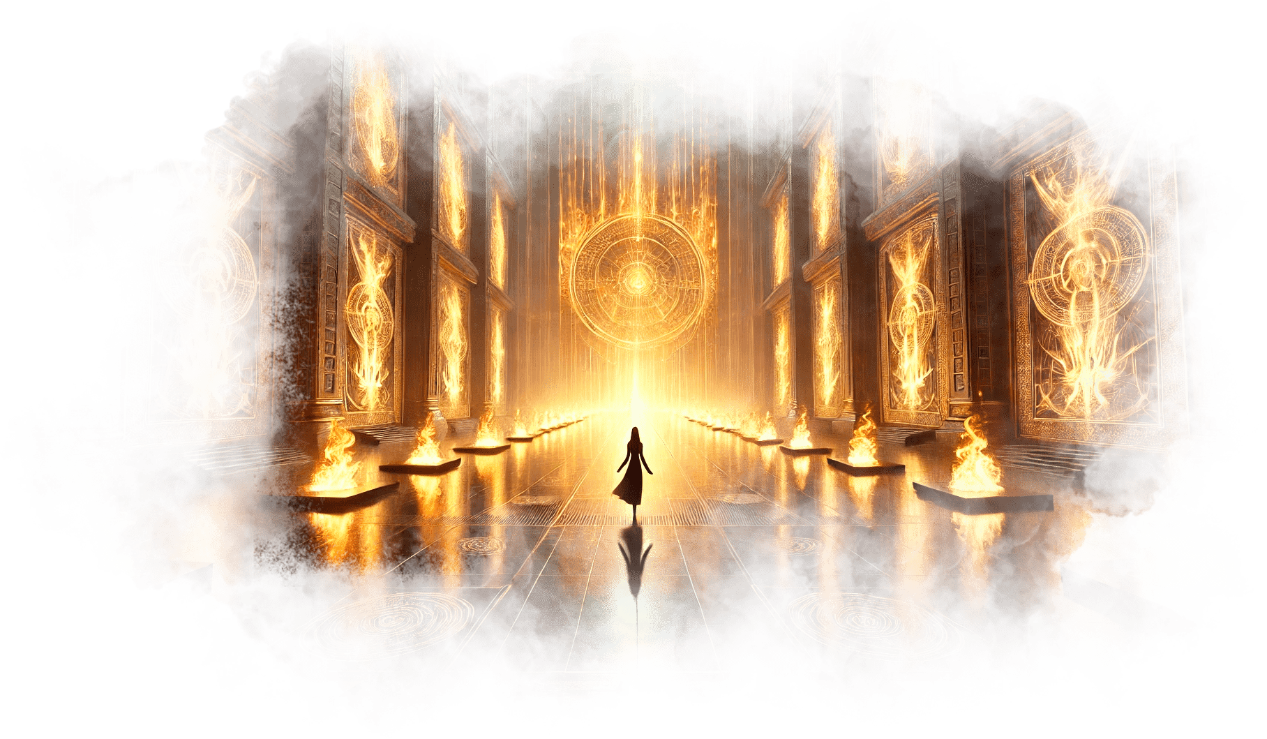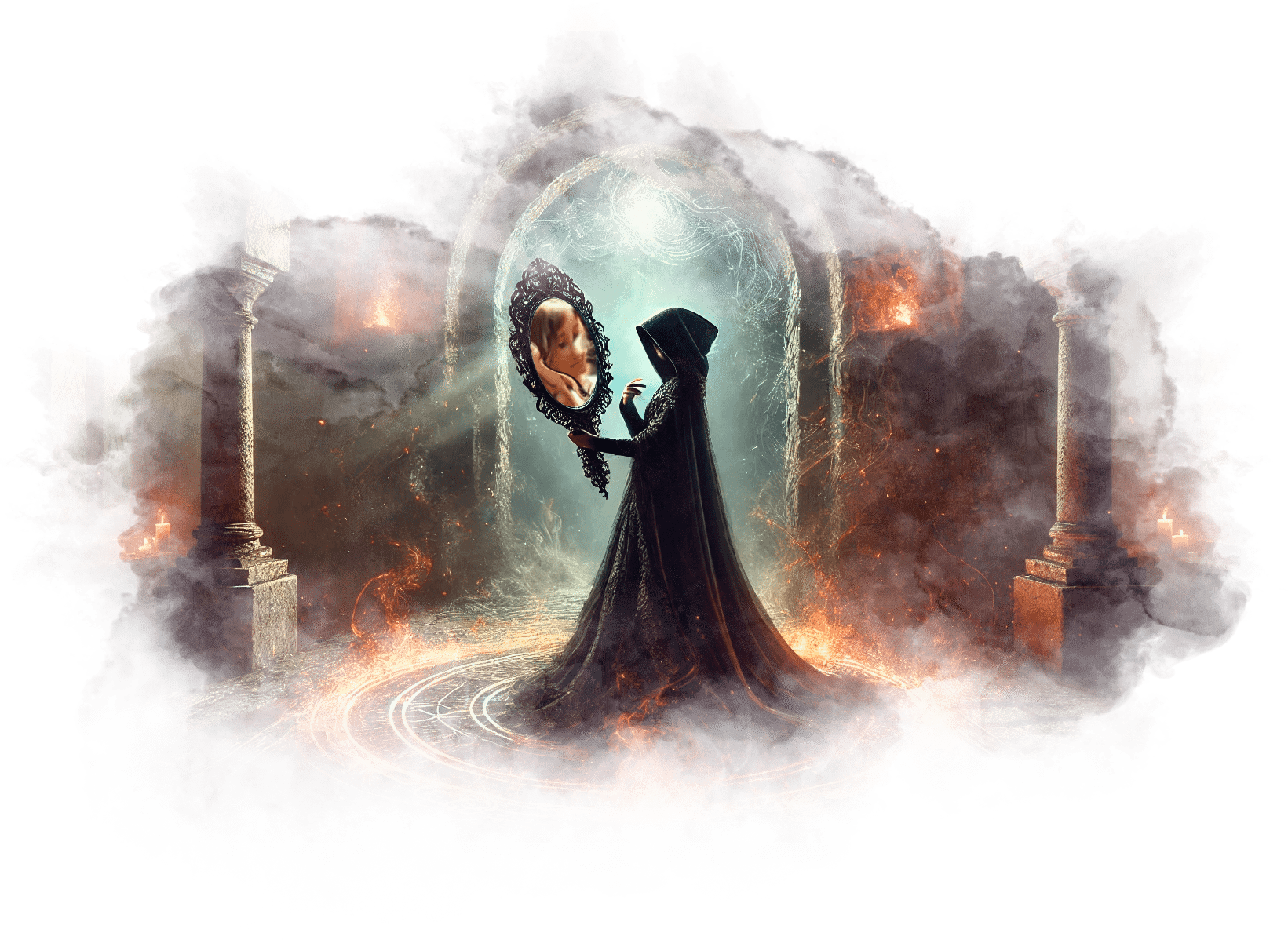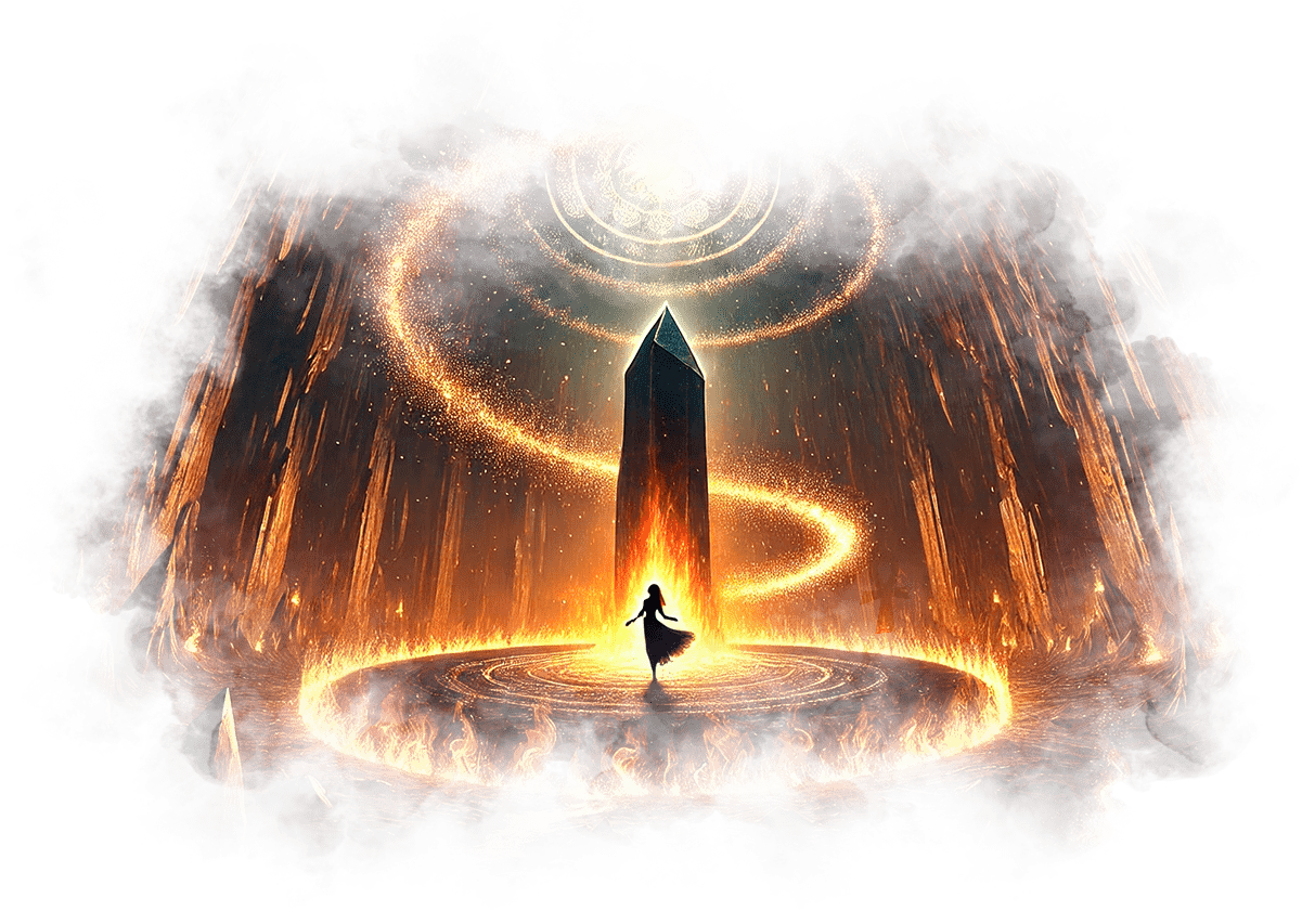 Галя выходит из Огненного Храма и попадает в Зал Теней. Здесь царит полумрак, воздух плотный, наполненный запахом старого воска и угасающего костра. Повсюду разбросаны старые зеркала, в каждом из которых отражаются её страхи и сожаления.