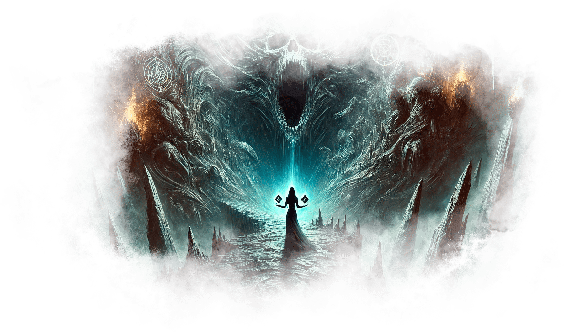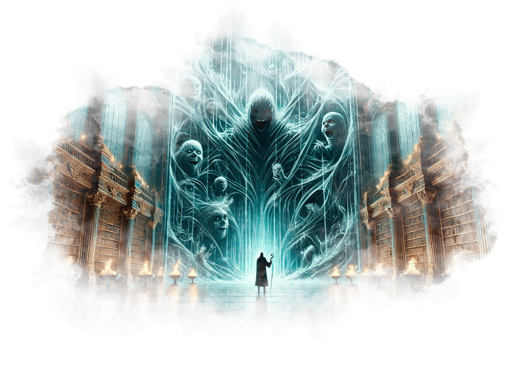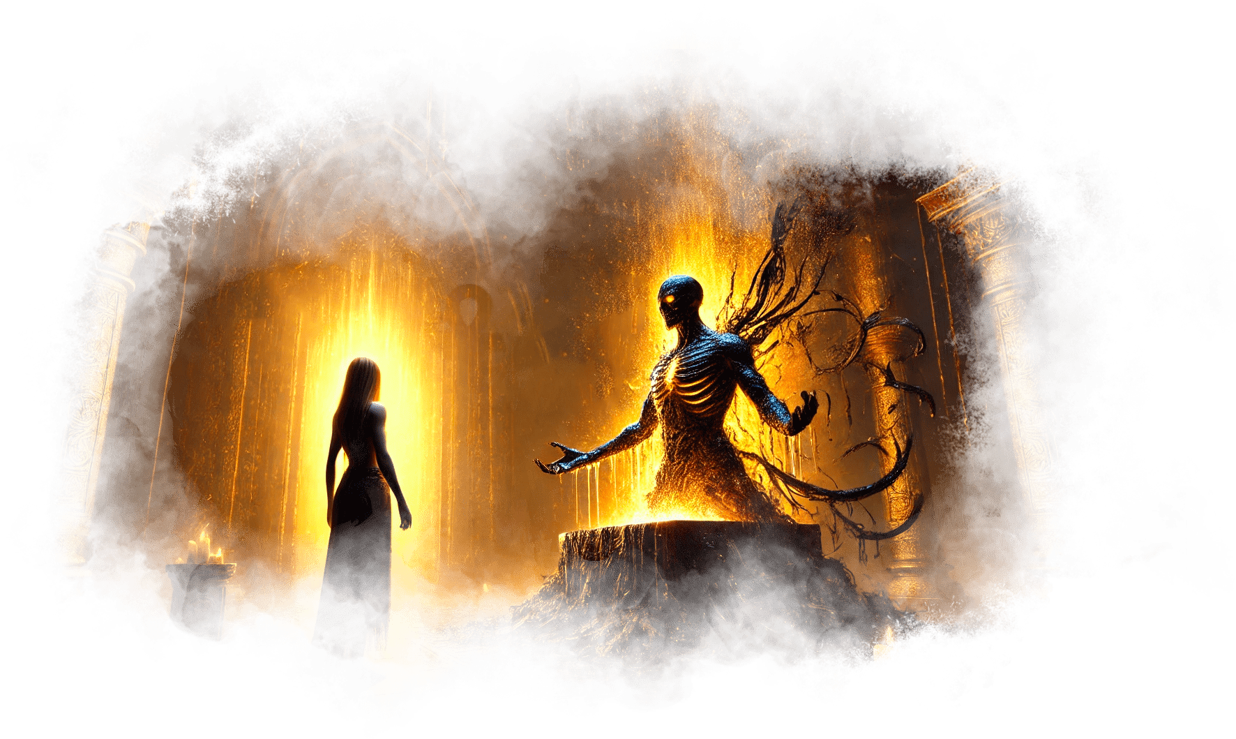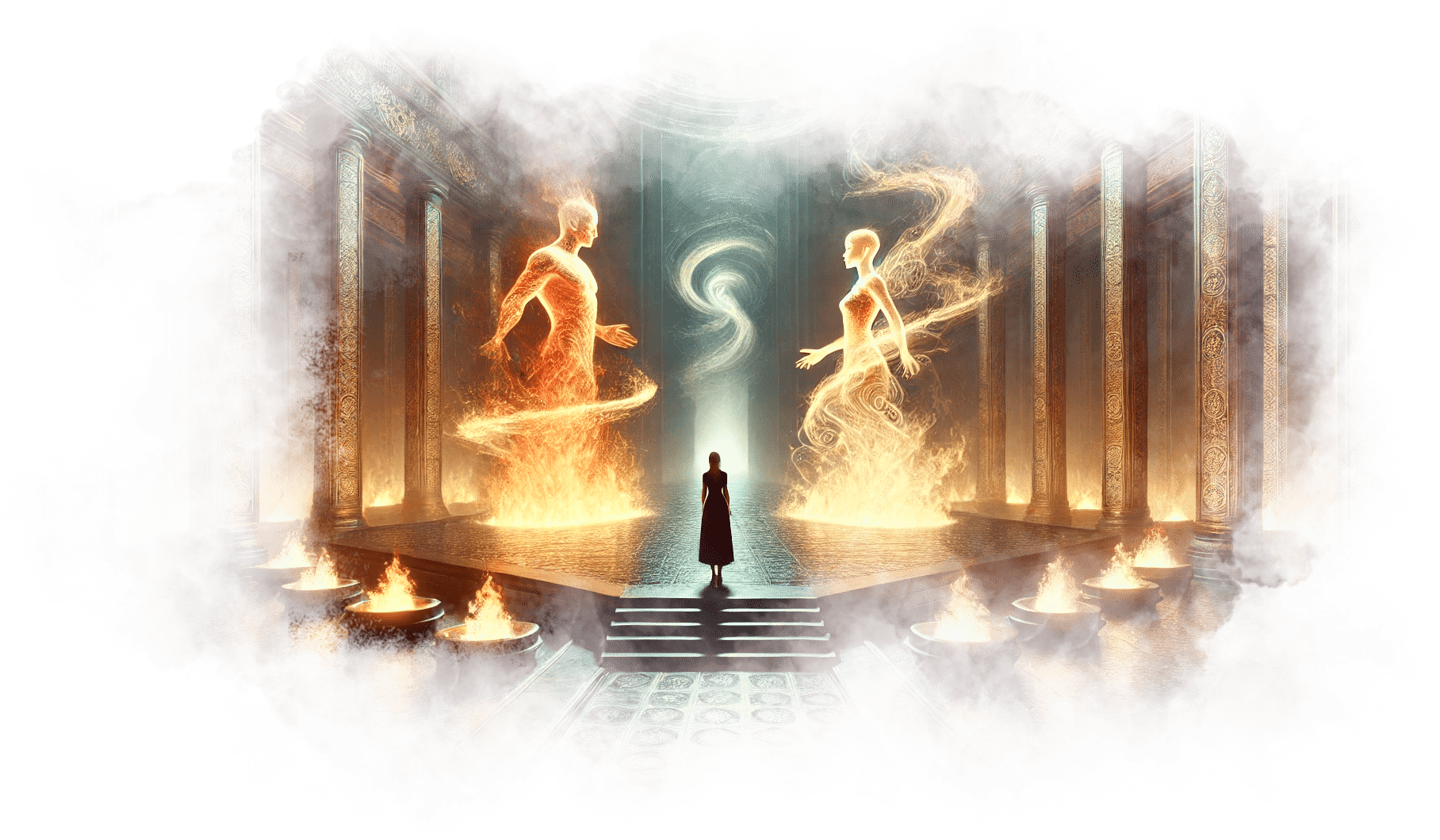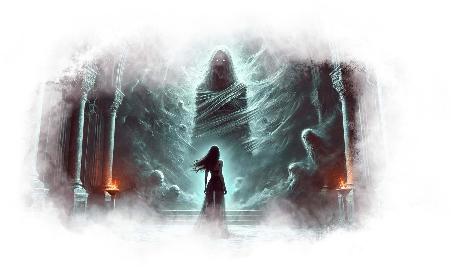 Галя выходит из Огненного Храма и попадает в Зал Теней. Здесь царит полумрак, воздух плотный, наполненный запахом старого воска и угасающего костра. Повсюду разбросаны старые зеркала, в каждом из которых отражаются её страхи и сожаления.