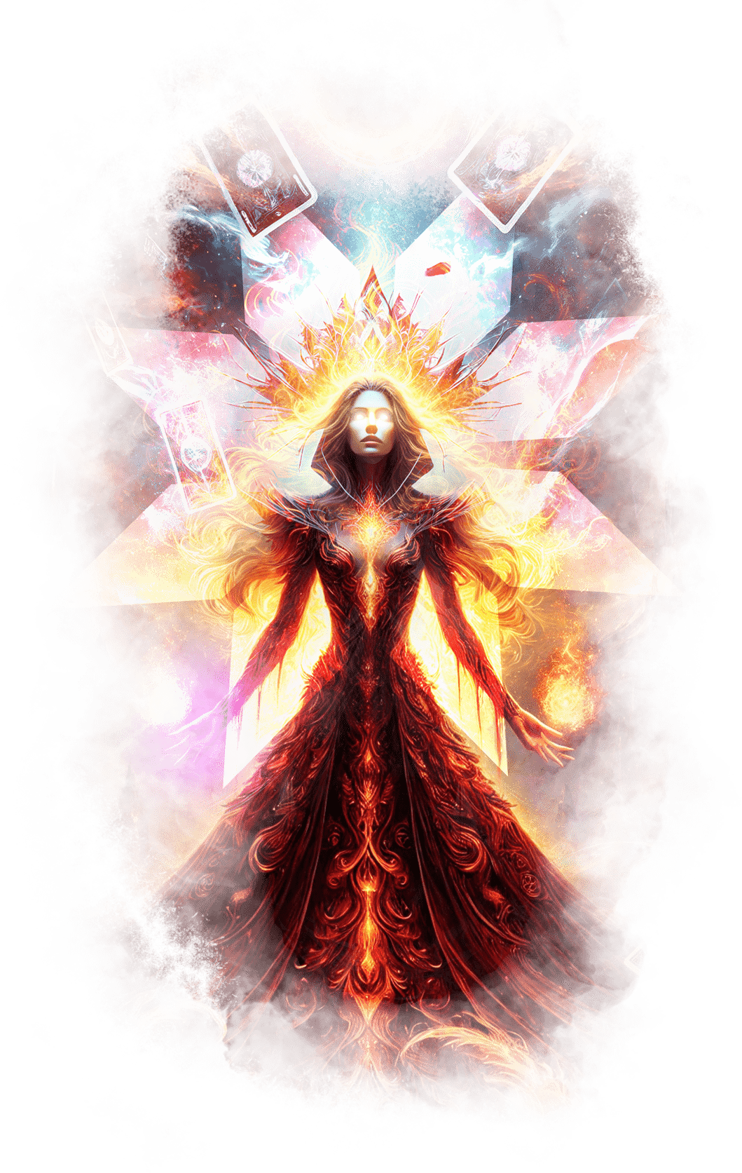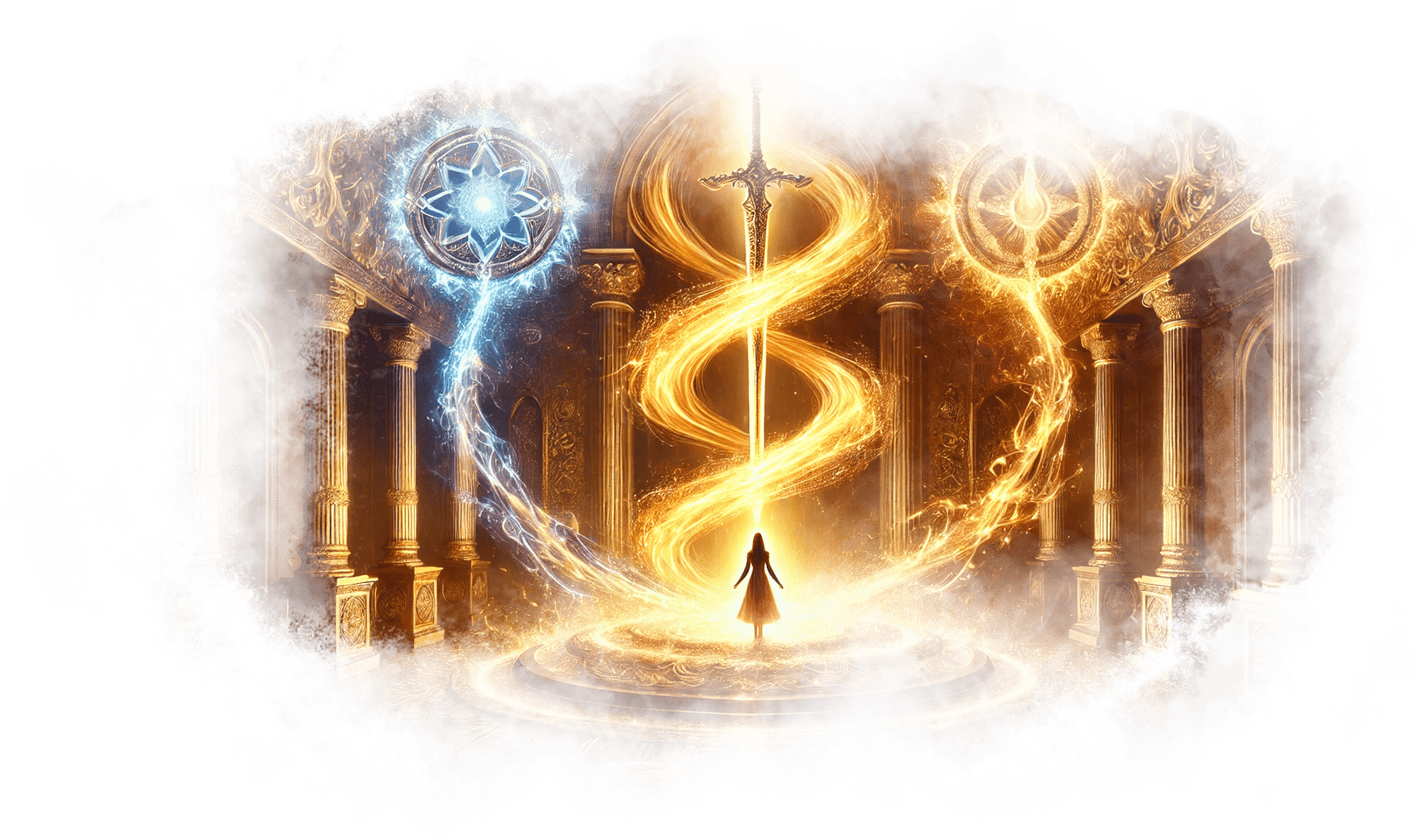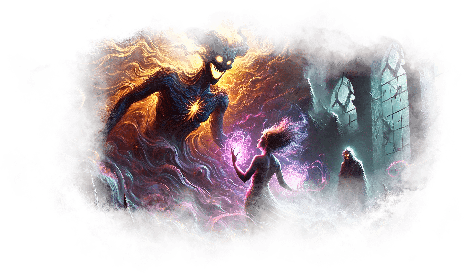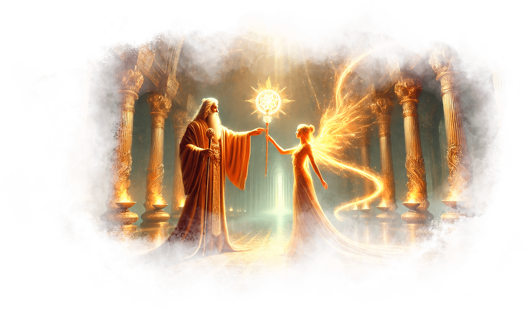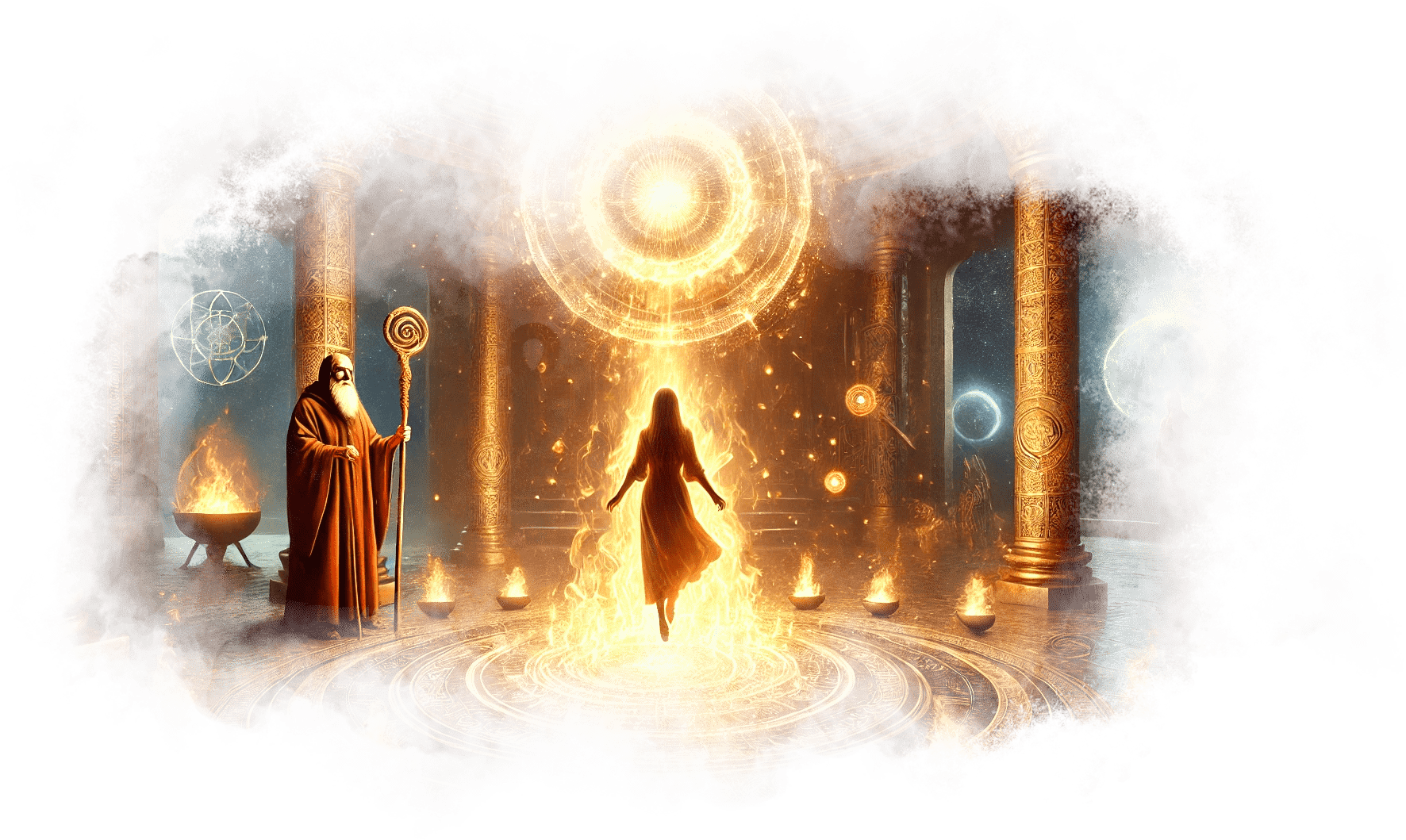 Галя протягивает руки вперёд, позволяя пламени взмыть к отчиму. Оно мягко растворяется в его груди, и его силуэт начинает мерцать золотым светом.
