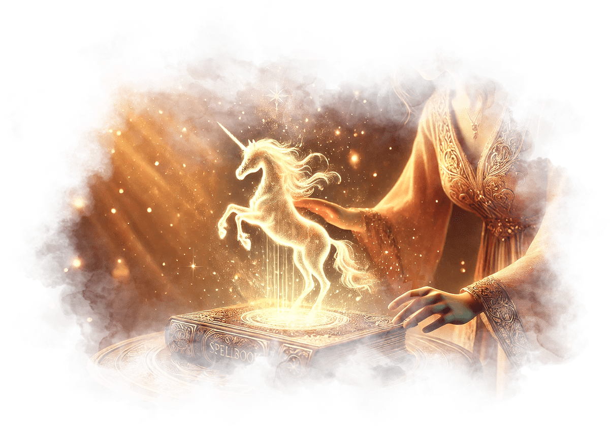 Единорог начинает мягко светиться и постепенно приобретает новый, сияющий облик.